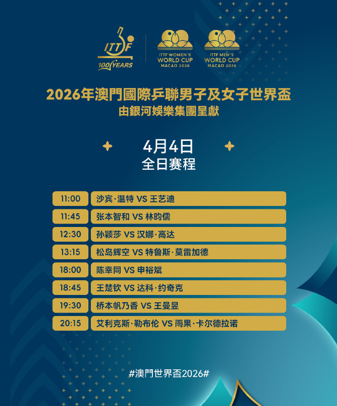 今天,国际乒联单打世界杯将展开1/4决赛的较量。女单赛场,四名中国队选手出战,孙颖莎对阵汉娜·高达,王艺迪迎战沙宾·温特,陈幸同和王曼昱分别面对申裕斌和桥本帆乃香。男单赛场,王楚钦的对手是达科·约奇克。(央视新闻)