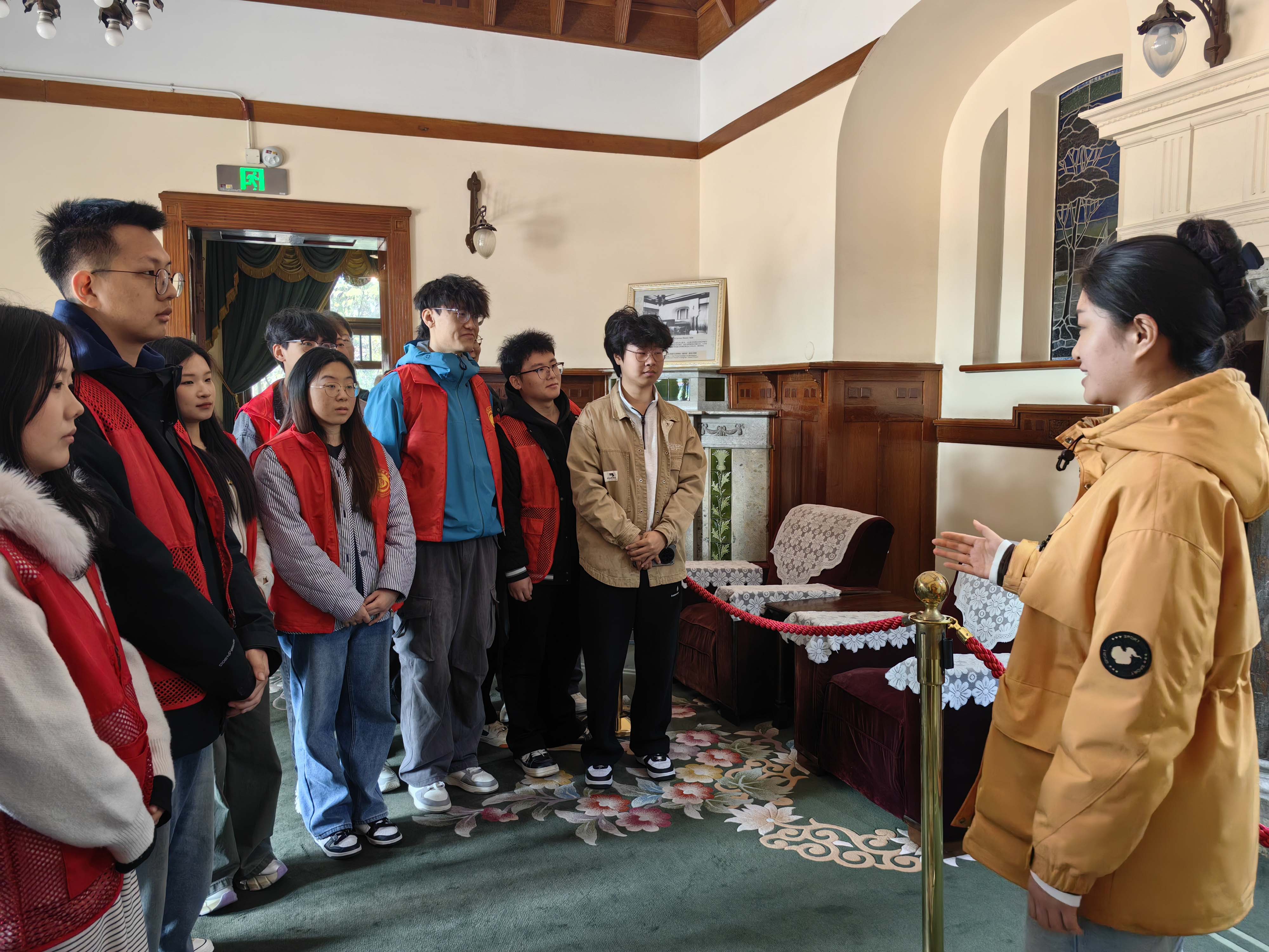 研究生程缘圆则把宣讲现场搬进了德国总督楼旧址博物馆(迎宾馆),在毛主席曾居住过的房间里,她生动讲述了毛主席在青岛期间深入基层调研、关心群众生活的感人故事。数学专业本科生主培君听完直呼:“站在那个房间里,仿佛能听到历史的回响!原来红色教育可以这么‘身临其境’。”