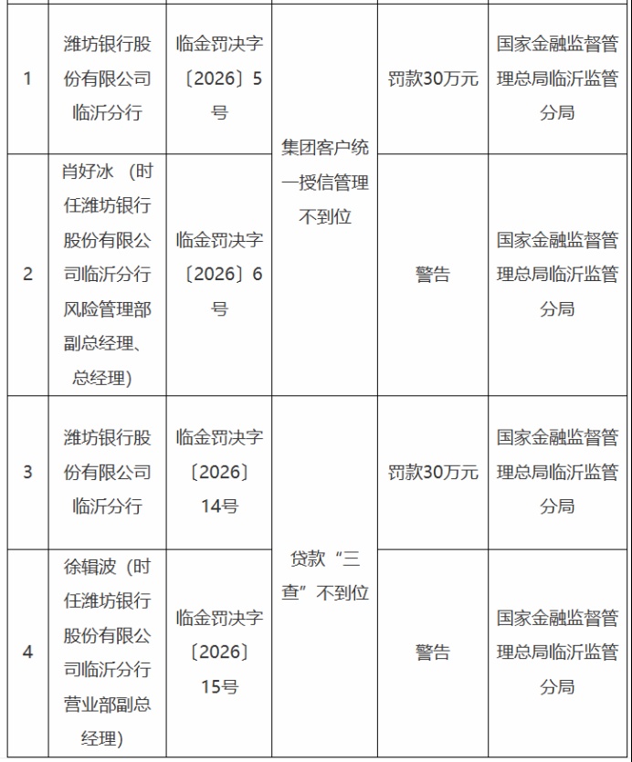 其中,因集团客户统一授信管理不到位,潍坊银行临沂分行被罚款30万元,同时,肖好冰 (时任潍坊银行股份有限公司临沂分行风险管理部副总经理、总经理)被警告;因贷款“三查”不到位,潍坊银行临沂分行被罚款30万元,同时,徐辑波(时任潍坊银行股份有限公司临沂分行营业部副总经理)被警告。