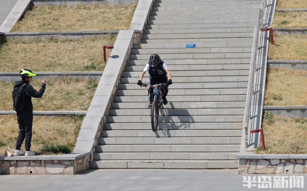 4月4日,岛城晴空万里、天气晴好。不少放假的孩子来到开阔场地骑行游玩,几名少年结伴组队,佩戴好头盔与护具,轮番展示各式自行车技巧,引得不少在海边骑行的家庭驻足观看。每到假期,海边总能见到骑行的身影,家长带着孩子骑行锻炼,既能强身健体,也能锻炼孩子的胆量与勇气。(半岛全媒体记者何毅)