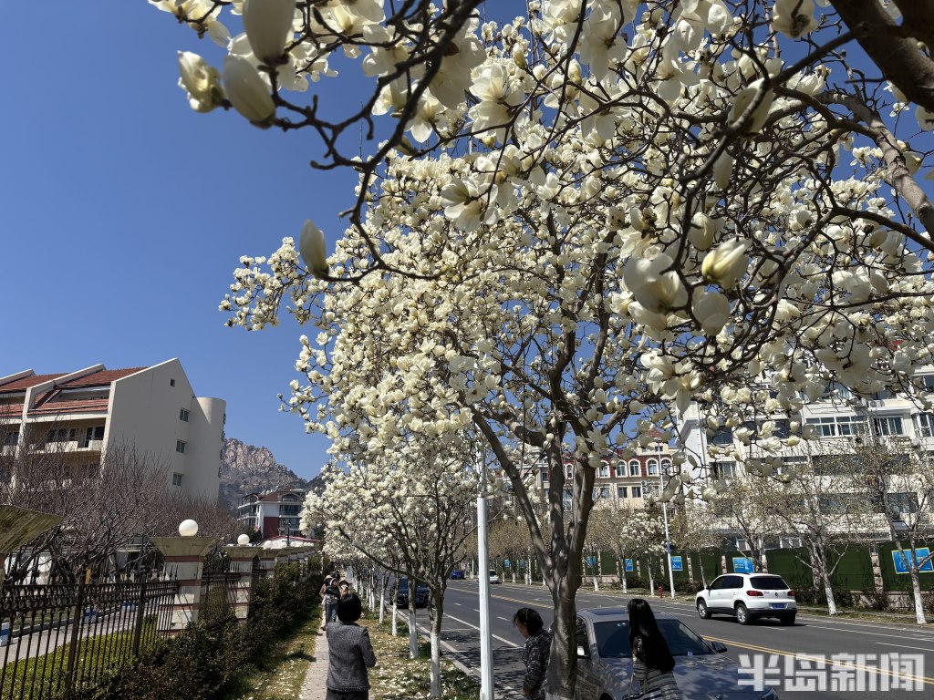 4月4日,青岛崂山区海宁路上,盛放的玉兰花暗香浮动、沁人心脾,不少路人纷纷驻足赏花拍照。道路西侧的玉兰已尽数绽放,东侧的白玉兰、紫玉兰也正次第开放。步入四月,这条被市民称作“玉兰大道”的道路迎来最佳观赏期,成为春日里一道亮丽的风景线。(半岛全媒体记者何毅)