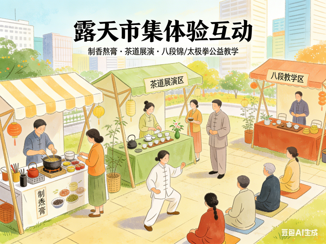 您将亲身体验制香熬膏、茶道展演,更有八段锦、太极拳公益教学,让您掌握实用康养技巧。