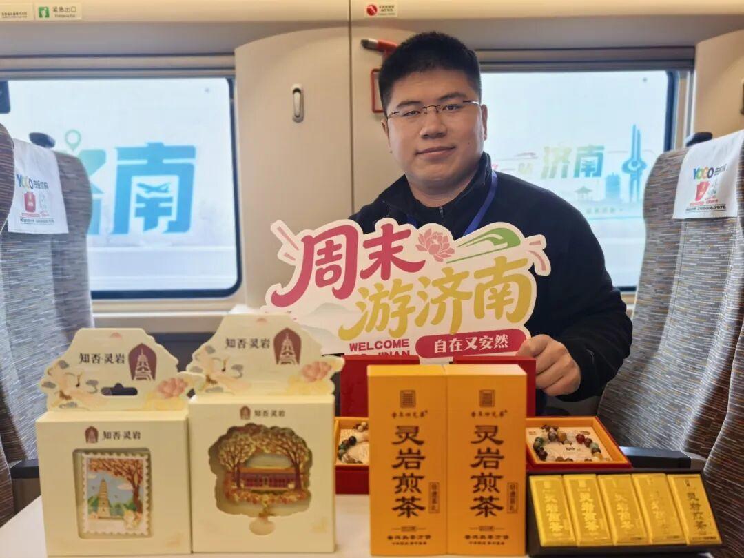 济南文旅推荐官家乐与任潇化身“一见清辛”组合(李清照、辛弃疾),带领旅客了解济南的人文历史、旅游资源和潮流地标。山东快书高派非遗传承人尹国鹏带来一段经典《武松打虎》,赢得满堂喝彩;灵岩小书生与旅客轻松对答,介绍灵岩寺的千年古韵。济南市杂技团青年魔术师张云峰带来变幻莫测的近景魔术表演,令现场旅客惊叹连连;济南市歌舞剧院青年歌唱演员丁晓鹏深情演唱《鹊华秋色》,以歌声描绘元代画家赵孟頫笔下的济南山水画卷。天下第一泉风景区带来《金风玉露宜相逢》演艺互动,让旅客在轻松愉悦中提前“种草”泉城风情。济南市文化和旅游局还精心准备了博物馆文创、野风酥休闲食品等城市礼物,让旅客在高铁车厢里提前感受济南的热情与韵味。