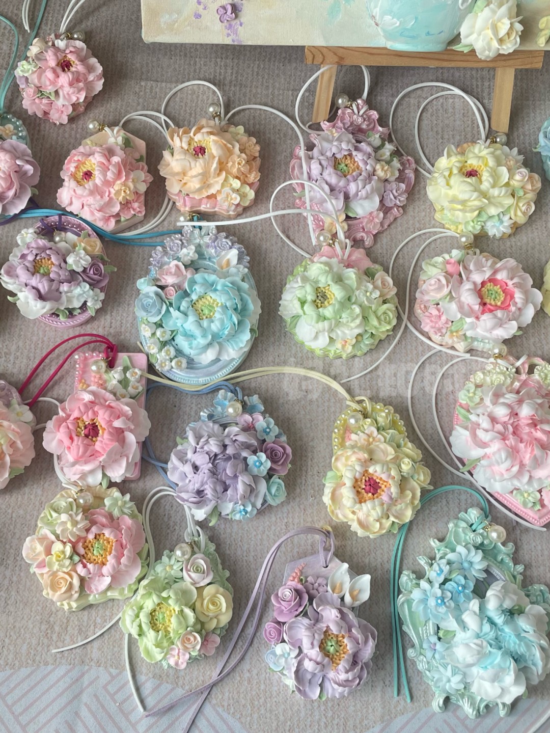 春日牡丹车挂。同样每一款都是纯手工制作,以超轻粘土为原材料,裱花袋做出牡丹造型,整体的色彩搭配没有冰箱贴的热烈,多了一份含蓄,就好像春天的风一样。同样找不到两款一模一样的车挂,做到了真正意义上的独一无二。