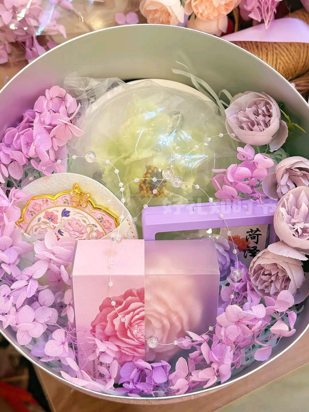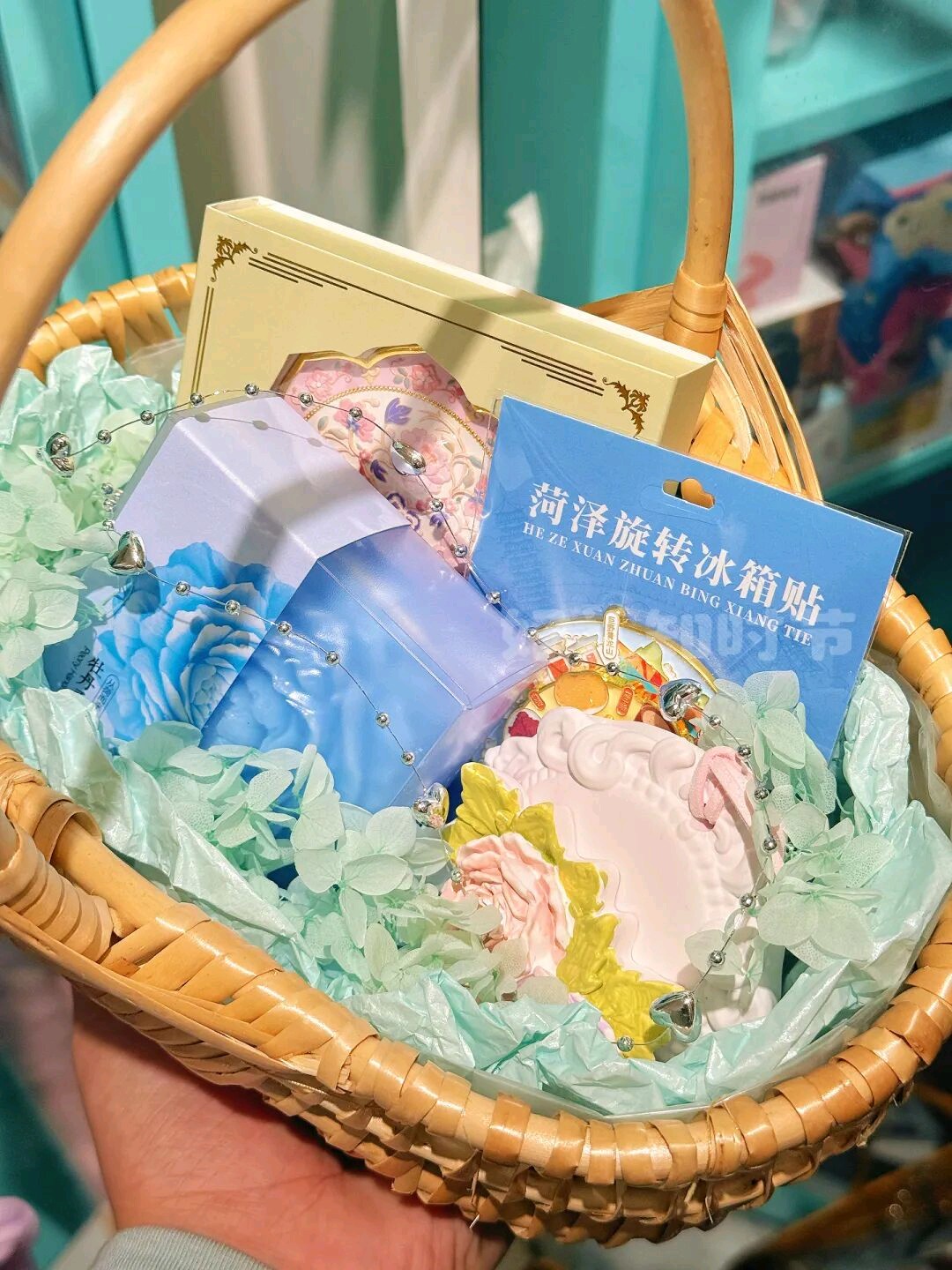 春日牡丹礼盒。以竹编篮为外观的牡丹礼盒,单品包含牡丹随身镜+菏泽特色旋转冰箱贴+牡丹精油皂+石膏牡丹车挂。外观用风吕敷做包装,以牡丹仿真花做点缀,颜色多款可选,也可根据喜欢的色系来搭配。