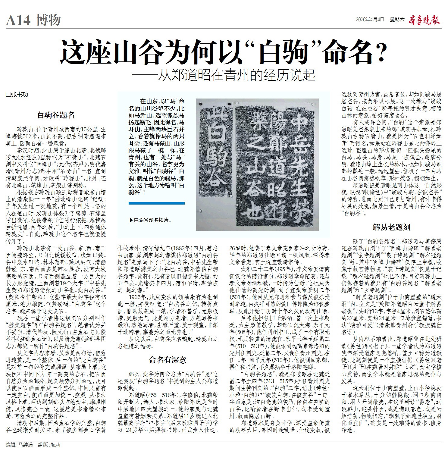 “白驹谷题名”,就是郑道昭在北魏延昌二年至四年(513—515年)担任青州刺史期间主持刊刻的。“白驹”二字,语出《诗经·小雅·白驹》中“皎皎白驹,在彼空谷”一句。字面意是:洁白光亮的骏马,停留在空旷的山谷,比喻贤者在野未出仕,或未受到重用,故而隐居山野。