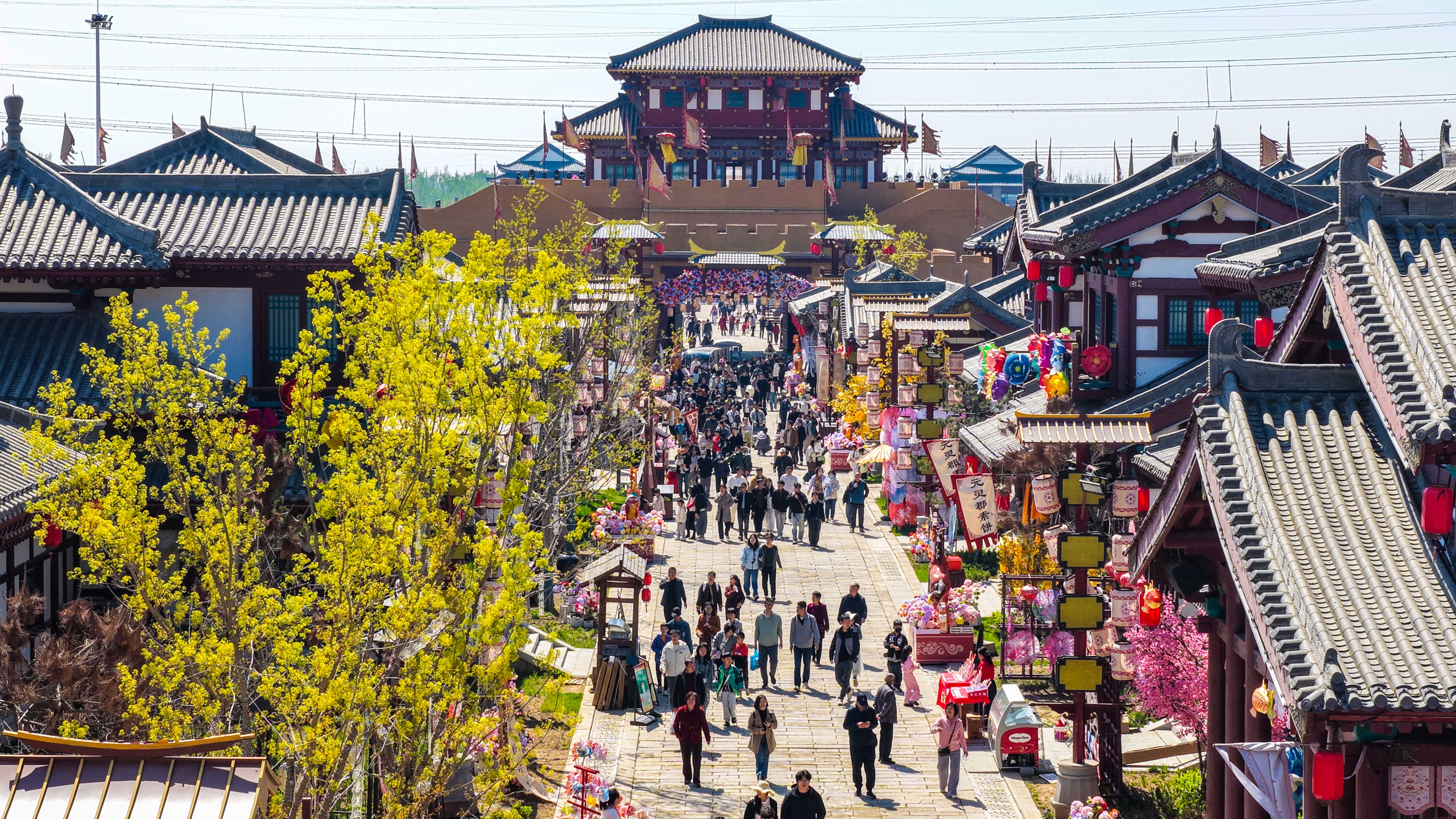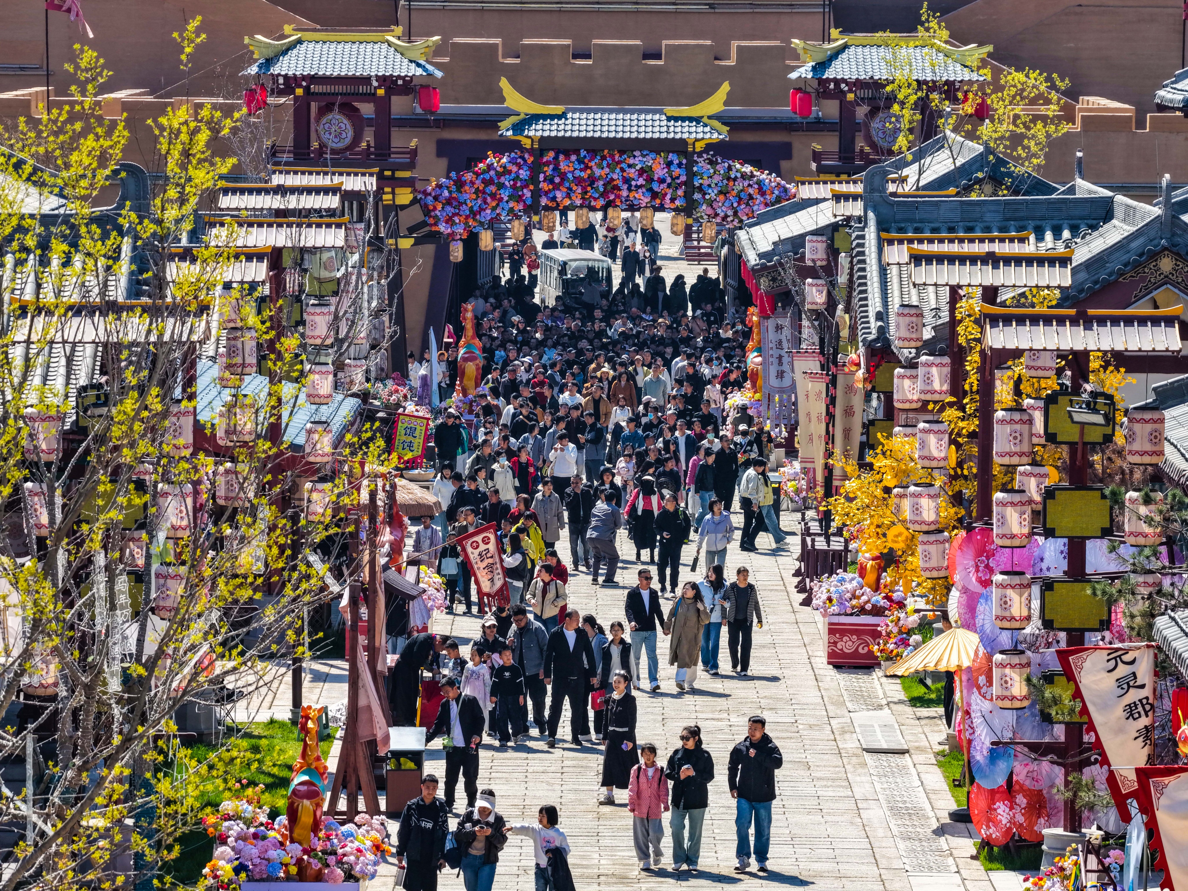 4月4日,山东省德州市乐陵影视城景区内游人如织(无人机照片)
