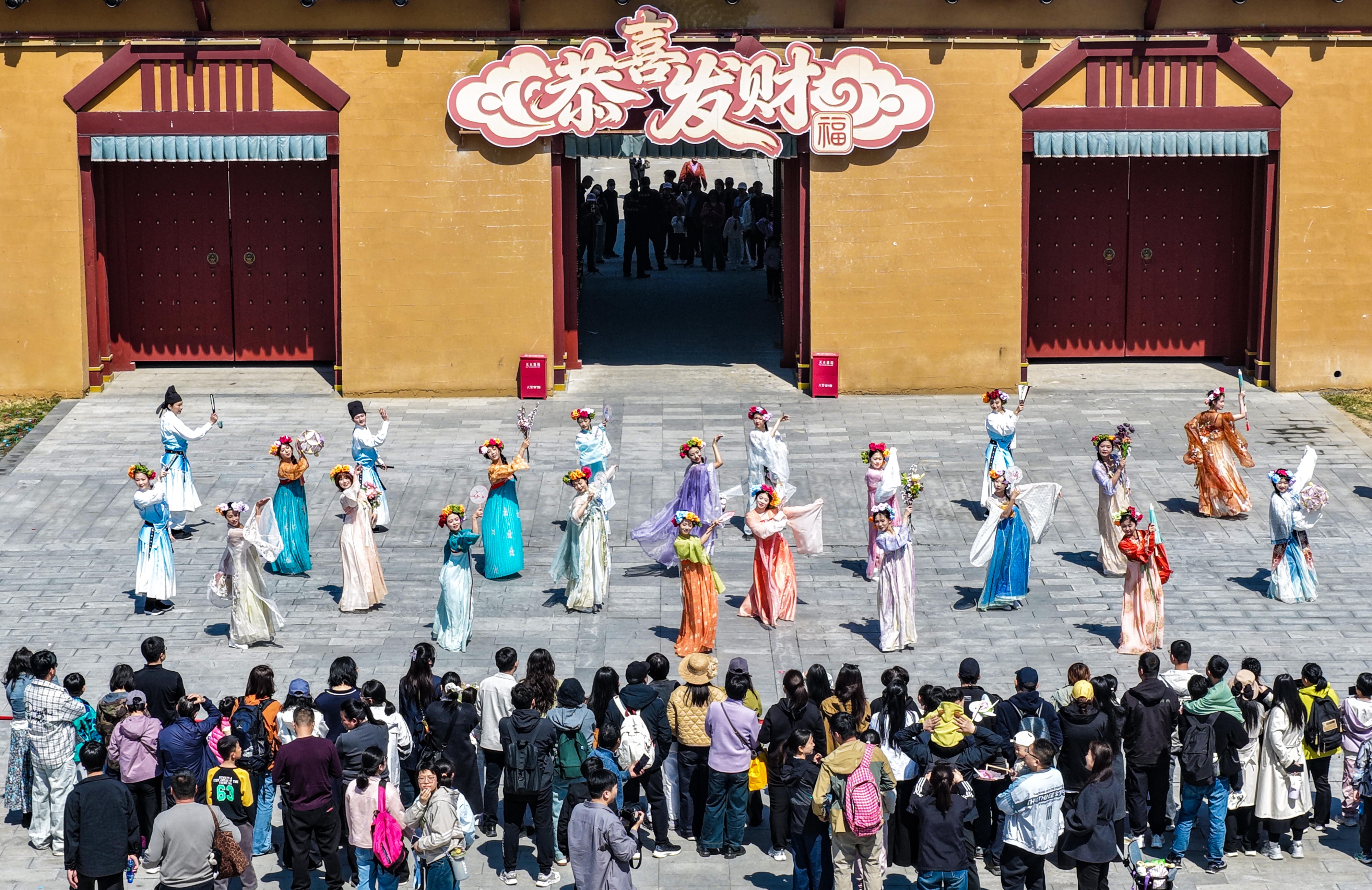 4月4日,游客在山东省德州市乐陵影视城景区内观看文艺演出(无人机照片)。