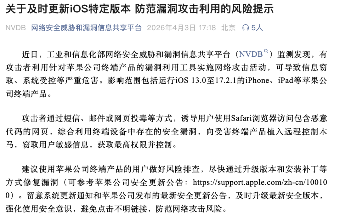 近日,工业和信息化部网络安全威胁和漏洞信息共享平台(NVDB)监测发现,有攻击者利用针对苹果公司终端产品的漏洞利用工具实施网络攻击活动,可导致信息窃取、系统受控等严重危害。影响范围包括运行iOS 13.0至17.2.1的iPhone、iPad等苹果公司终端产品。