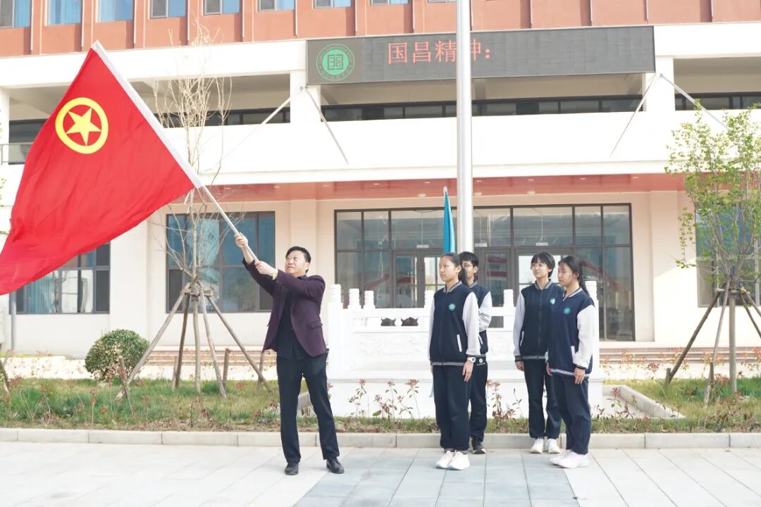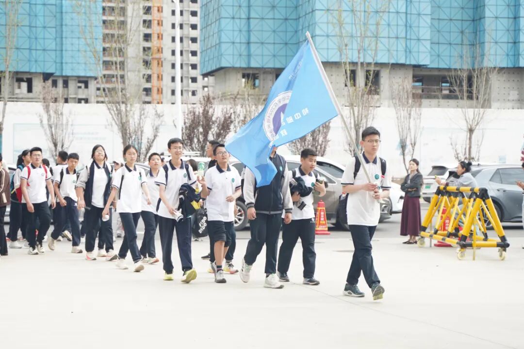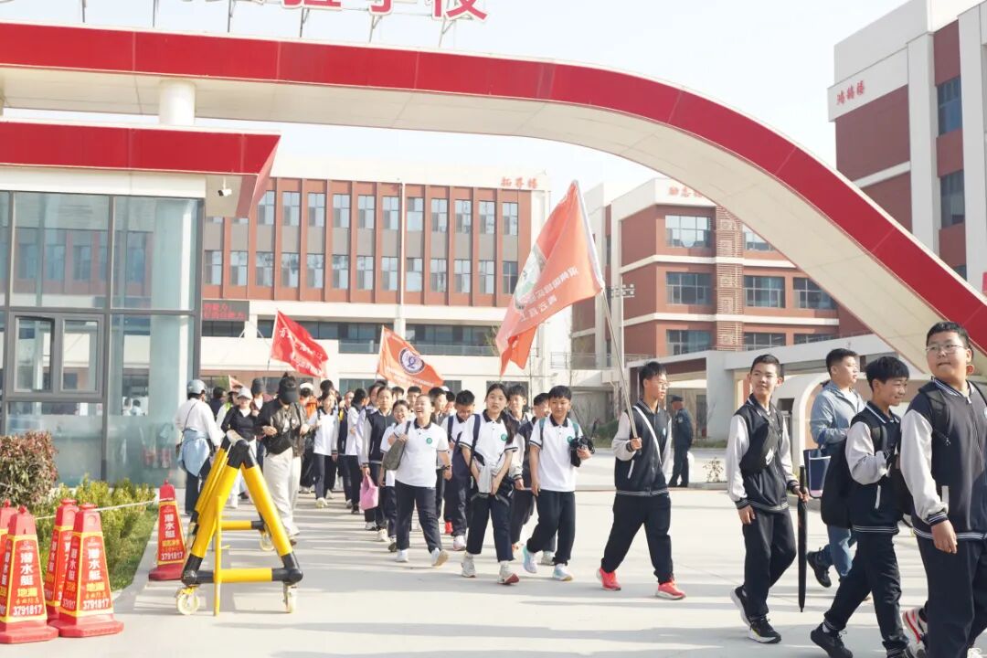 滨州国昌实验学校校长刘允祥授旗并发布远足出发令,队伍出发。