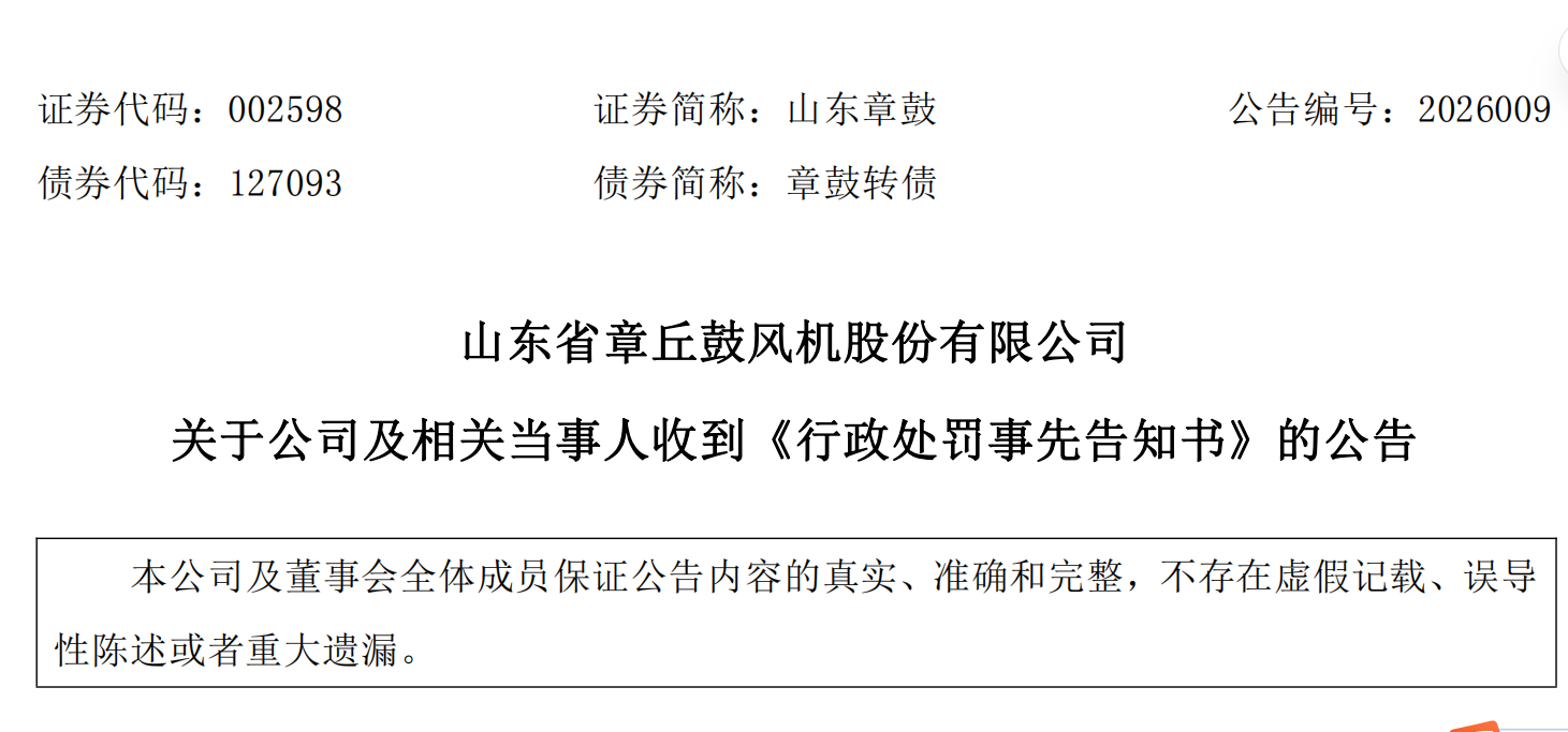 4月3日,山东章鼓(002598.SZ)公告称,公司及相关当事人收到山东证监局出具的《行政处罚事先告知书》,因2024年年报存在虚假记载、虚减利润,公司股票将于4月7日开市起停牌1天,自4月8日开市起复牌并被实施其他风险警示,证券简称由“山东章鼓”变更为“ST章鼓”,证券代码不变,交易日涨跌幅限制调整为5%,公司以及相关责任人将面临690万元罚款处罚。
