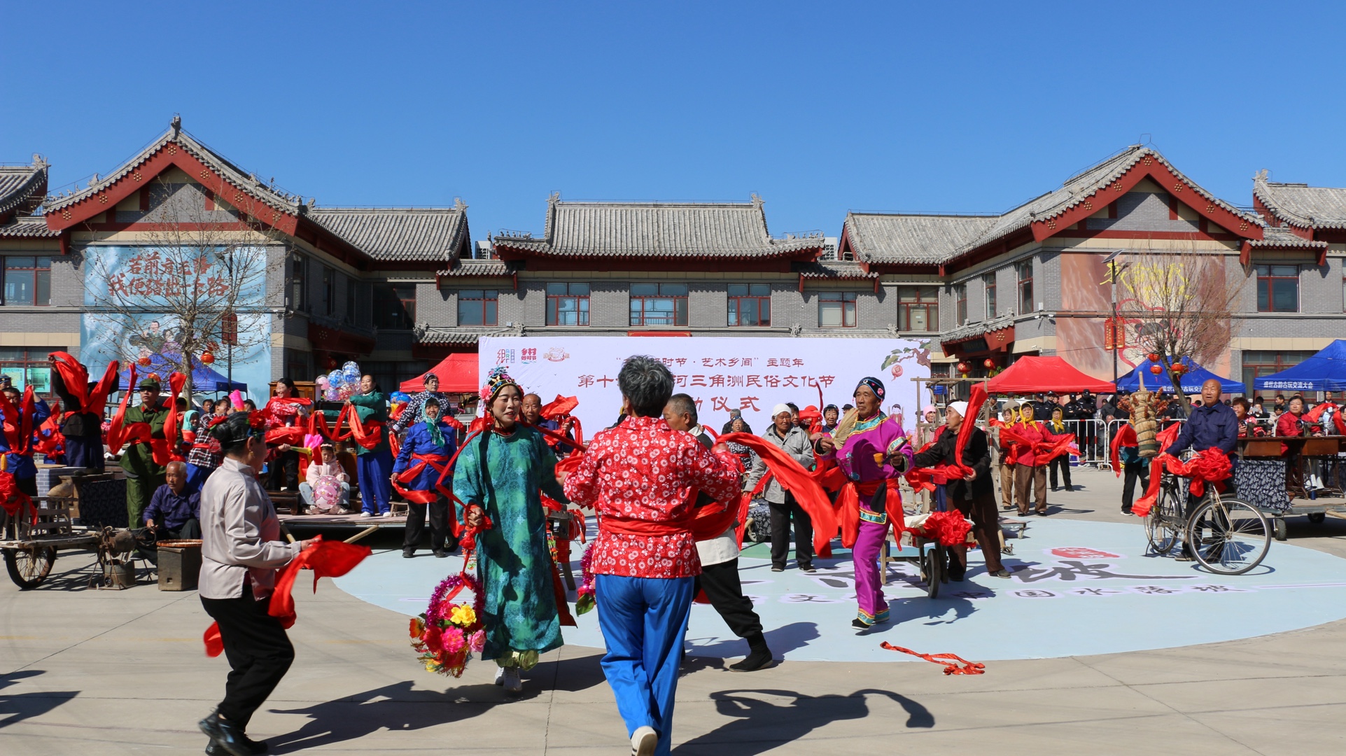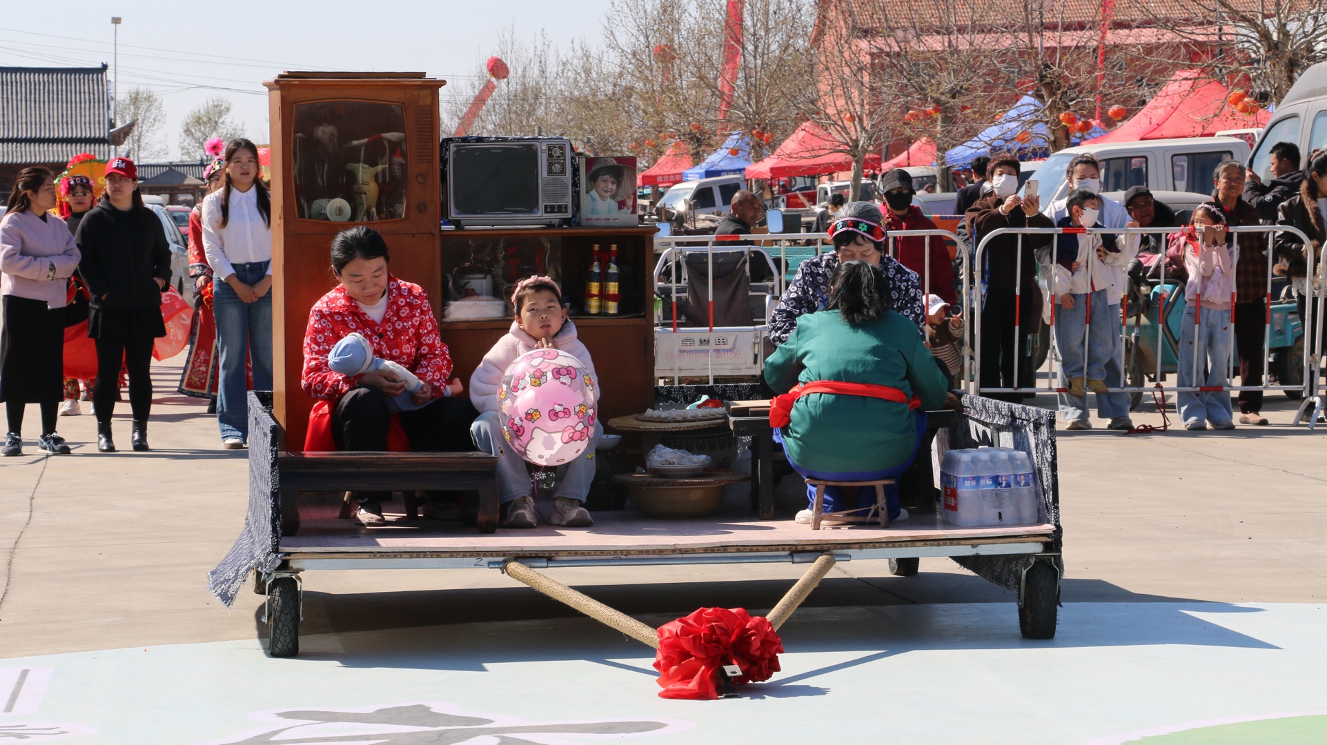 当地的民俗社火“年代秀”也让民俗“动”起来。民俗社火“年代秀”以上世纪70—80年代群众熟悉的乡村生产、生活原型为素材,高度还原了鲁北乡村,赶集、串门、过年等生活场景以及春耕、夏种、秋收忙碌的劳作场面。表演队由百余人组成,年龄最大的70多岁,最小的6岁,参演人员全部是土生土长的本地群众,表演所需的100余种道具,正是当地的古家具。