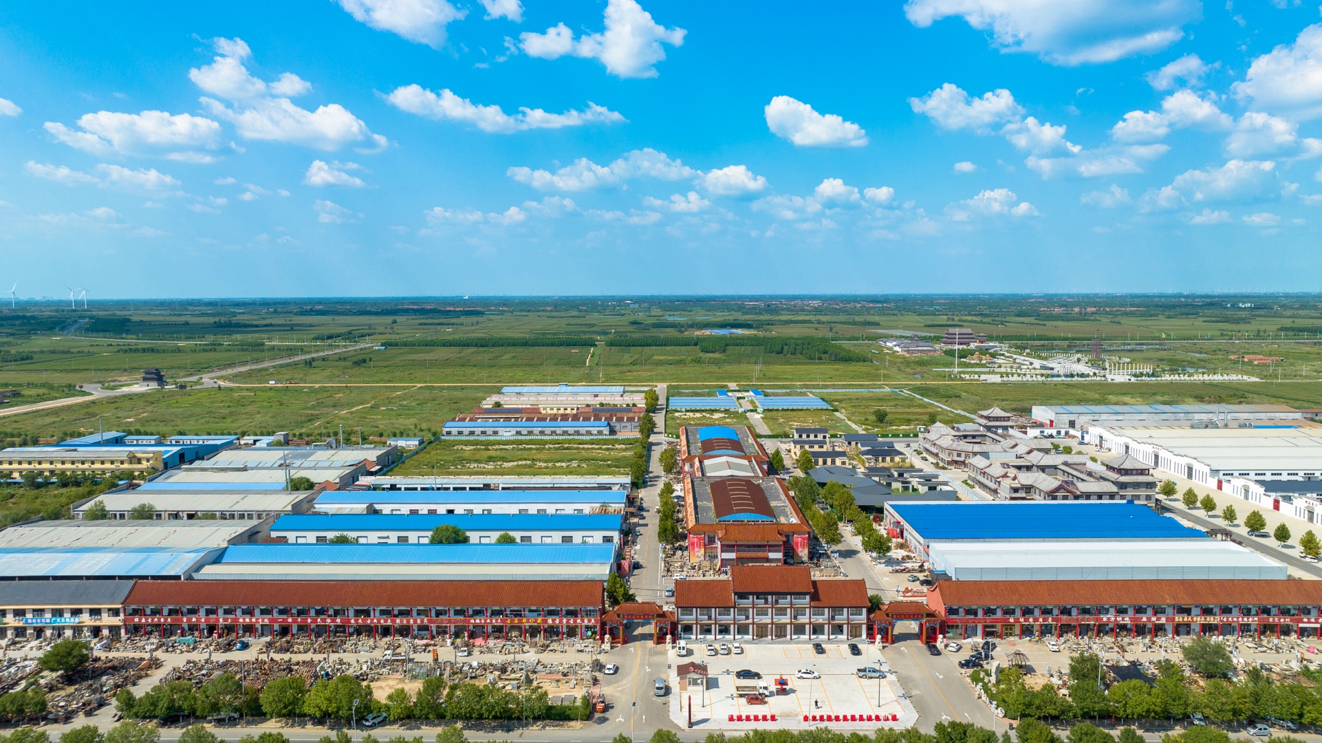 踏入园区,古典建筑群撞入眼帘,将人带入古色古香的民俗意境中。作为2010年正式成立的综合性园区,这里总占地面积达4.01平方公里,以盘古大道为中心,北至滨阳大道、南至滨阳路,东至楚家、西至小开河,盘古大道、钟楼大街、鼓楼大街的建筑群错落有致,构成了一幅兼具古韵与烟火气的民俗画卷,也印证着“北有高碑店,南有阳信县”的行业美誉。