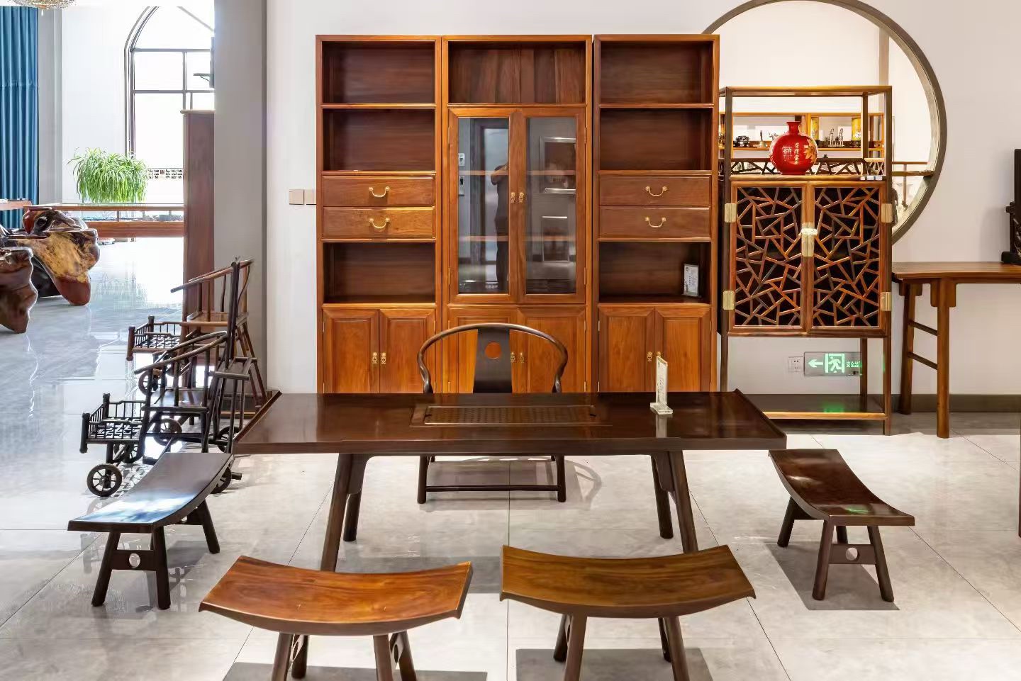 沿盘古大道前行,园区以鲁北民俗文化产业园为中心,发展了“鼎龙、意象、盘古、桃园、德鑫、克莱斯克、昊天”七个古典家具古玩交易市场。市场门店内,古典家具、木雕古玩琳琅满目,或古朴厚重,或精巧灵动。这些家具与物件,从选料、开料、雕刻到打磨、上漆,每一道工序都精益求精,既保留传统韵味,又贴合现代审美。园区引导交易市场抱团发展,整合资源与工艺,也让老手艺有了新市场。