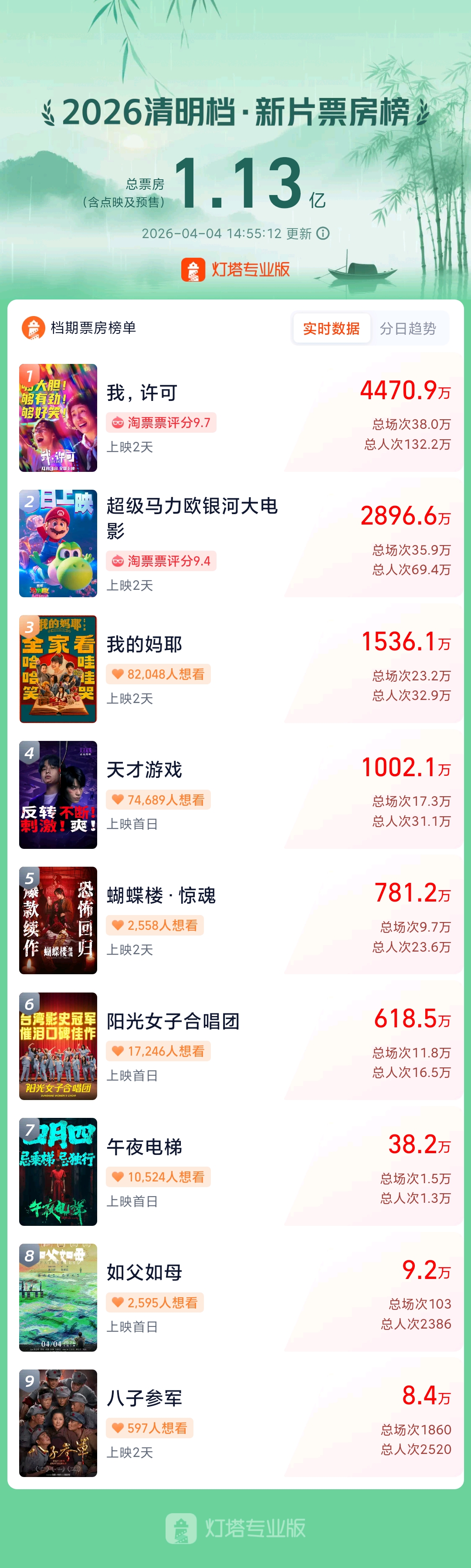 据网络平台数据,截至目前,2026年清明档新片总票房(含预售)突破1.13亿元。其中《我,许可》《超级马力欧银河大电影》《我的妈耶》以4467万元、2892万元、1534万元的成绩分列前三。《天才游戏》《蝴蝶楼·惊魂》《阳光女子合唱团》紧随其后。大众新闻·齐鲁壹点记者刘宗智