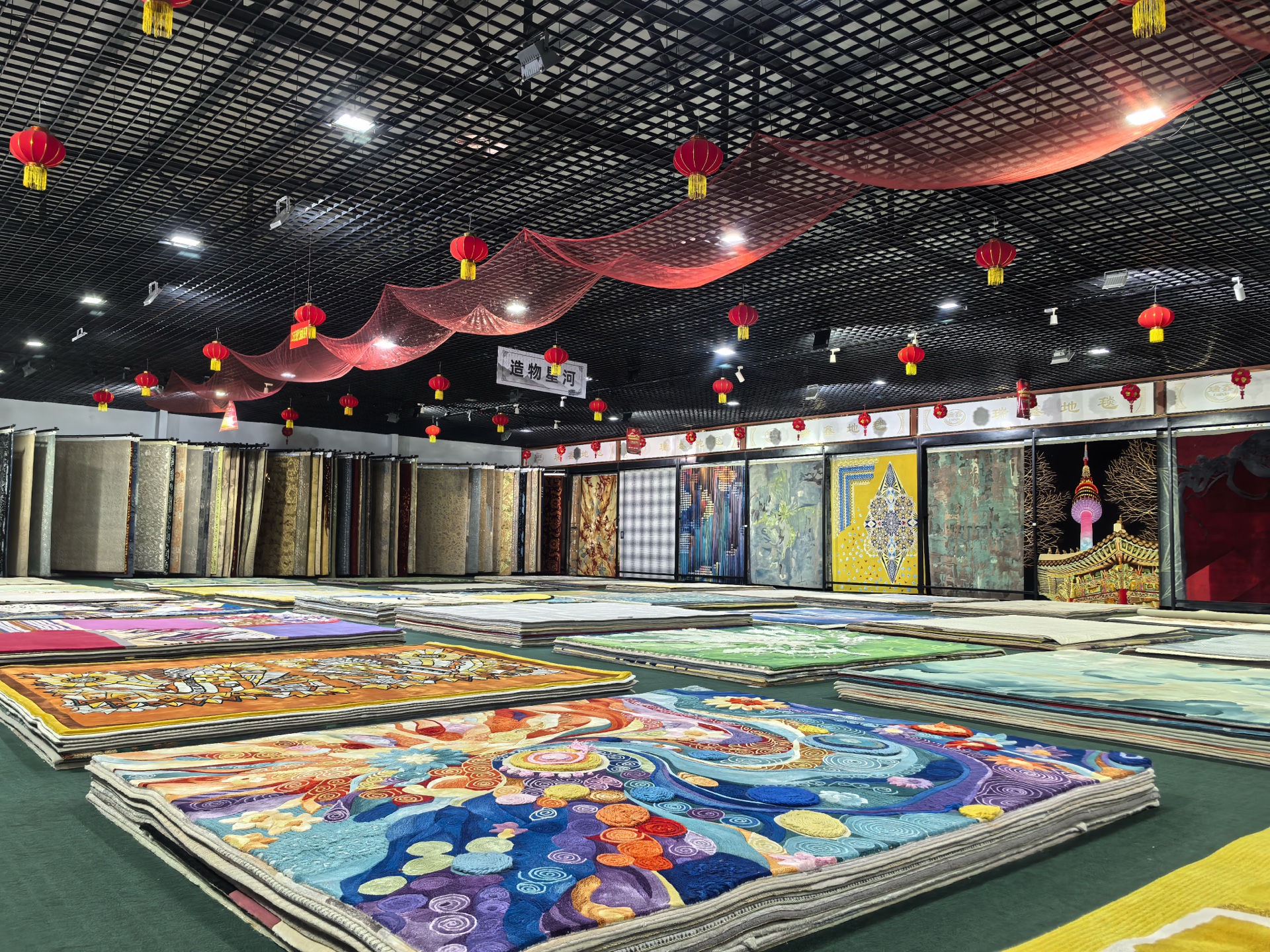 步入瑞鑫集团生产车间,一派热火朝天的生产景象映入眼帘。工人们手持簇绒枪,专注投入、井然有序地开展大尺寸地毯织造作业,车间内机器运转的“嗒嗒”声此起彼伏、不绝于耳,五颜六色的毛线在簇绒枪的作用下,被稳稳扎进棉布之中,编织出形态各异、错落有致的线条,这些线条层层叠加、巧妙组合,慢慢勾勒出繁复精美、风格各异的图案,尽显传统织造工艺与现代生产相结合的匠心质感。