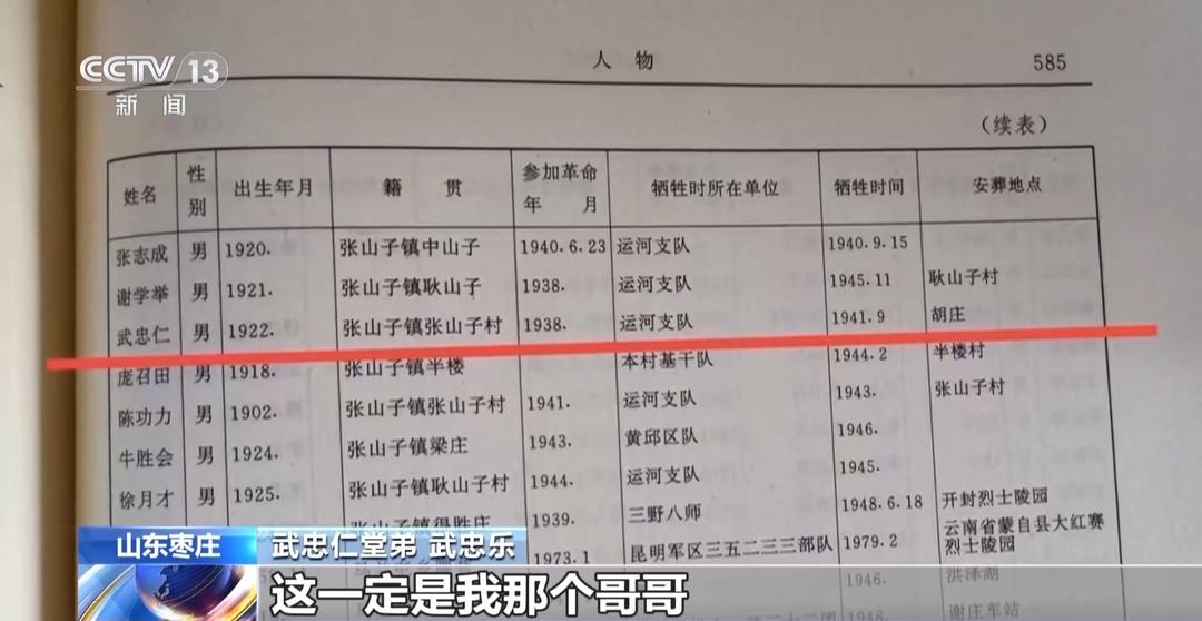 根据当地人的记忆,那个年代从台儿庄一带离家参军的年轻人,大多编入运河支队。有了进一步的线索,结合离家时间、年龄等信息,研究人员查阅区志、比对档案,最终确认,烈士名单中这位八路军115师运河支队的抗日战士武忠仁,正是武忠英的大哥。