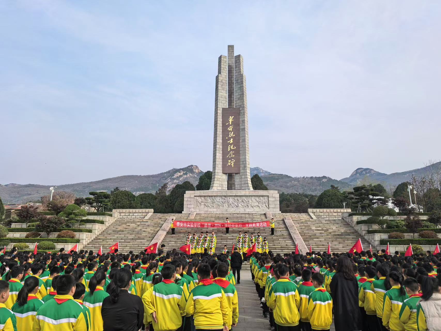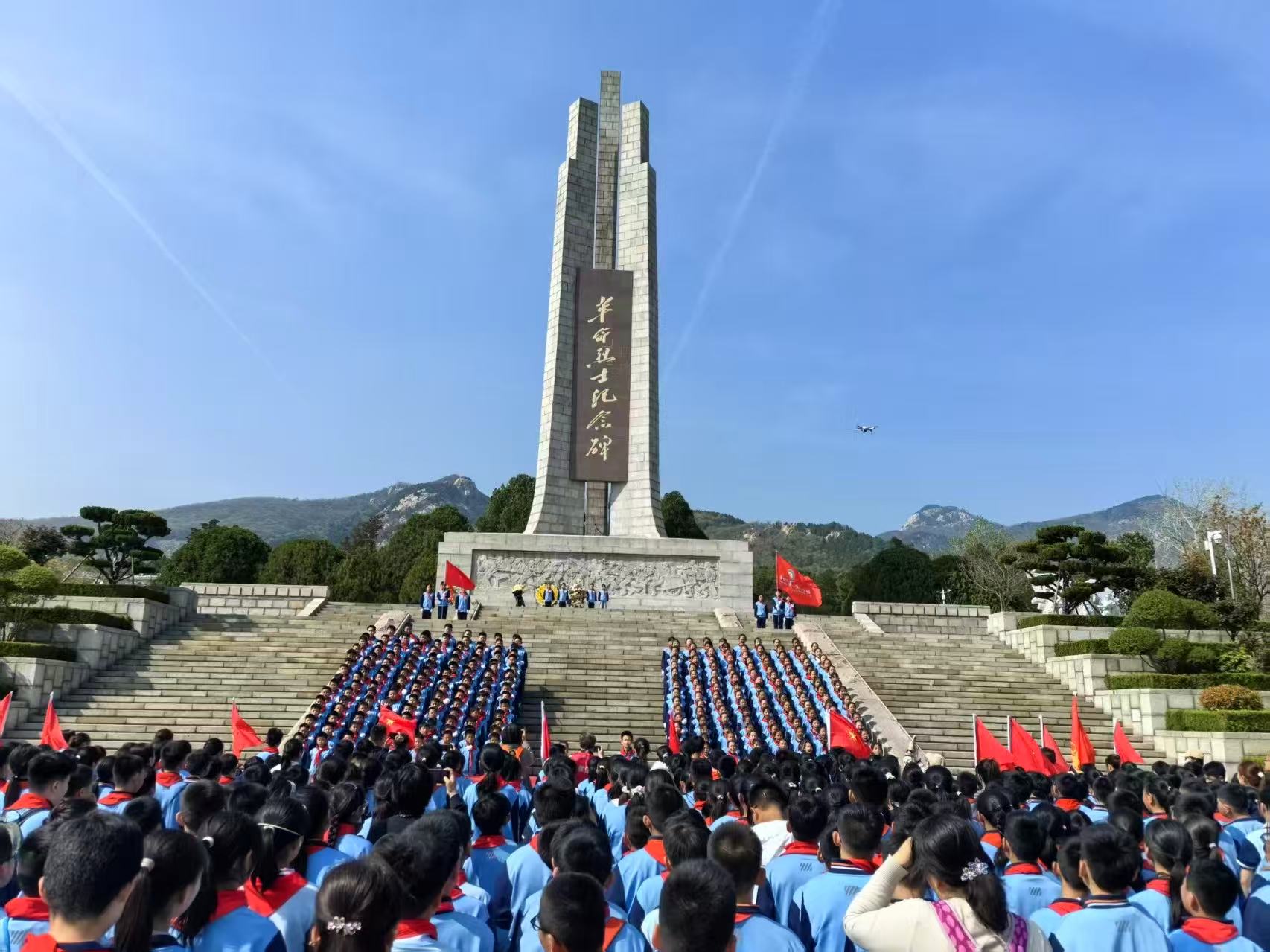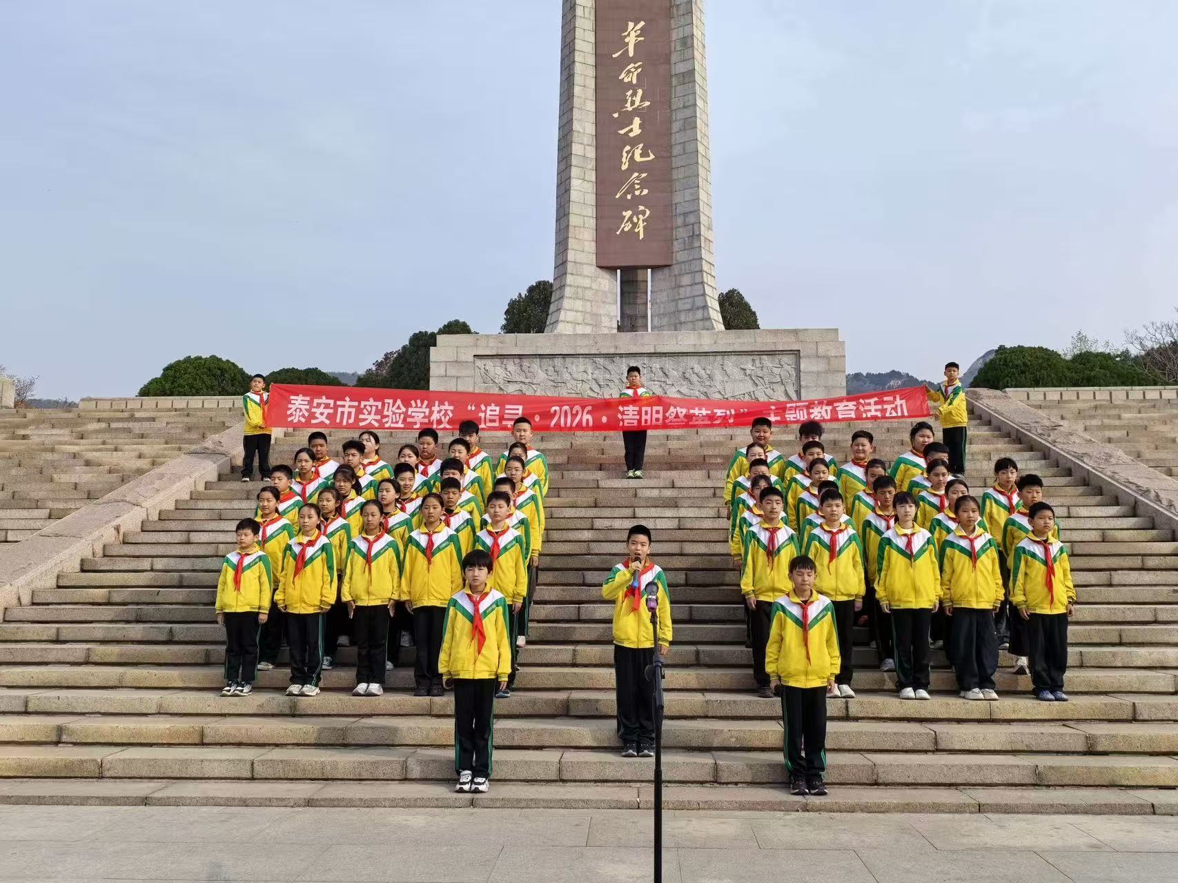 全区各学校积极响应、迅速行动。泰安市实验学校组织广大学生到泰安烈士陵园瞻仰宣誓、祭扫献花。在活动现场,全体师生肃立列队,九百余名少先队员齐声高唱《中国少年先锋队队歌》,铿锵有力的歌声,饱含着对革命先烈的无限崇敬。随后,五十余名少先队员深情献词《清明追思英烈志,薪火相传勇担当》,以少年之声致敬英烈,既是对英烈事迹的深情回望,更是对红色精神的坚定传承。少先队员们还有序前往烈士墓前献花,小宣讲员现场讲述洪涛烈士的英勇事迹,使少年队员们深受教育,深刻感悟今天幸福生活的来之不易,从而坚定让红色基因融入血脉、代代相传的信心和决心。