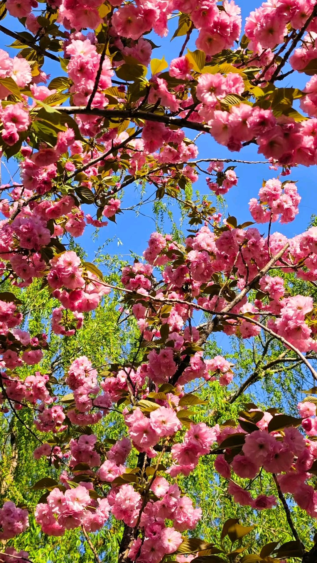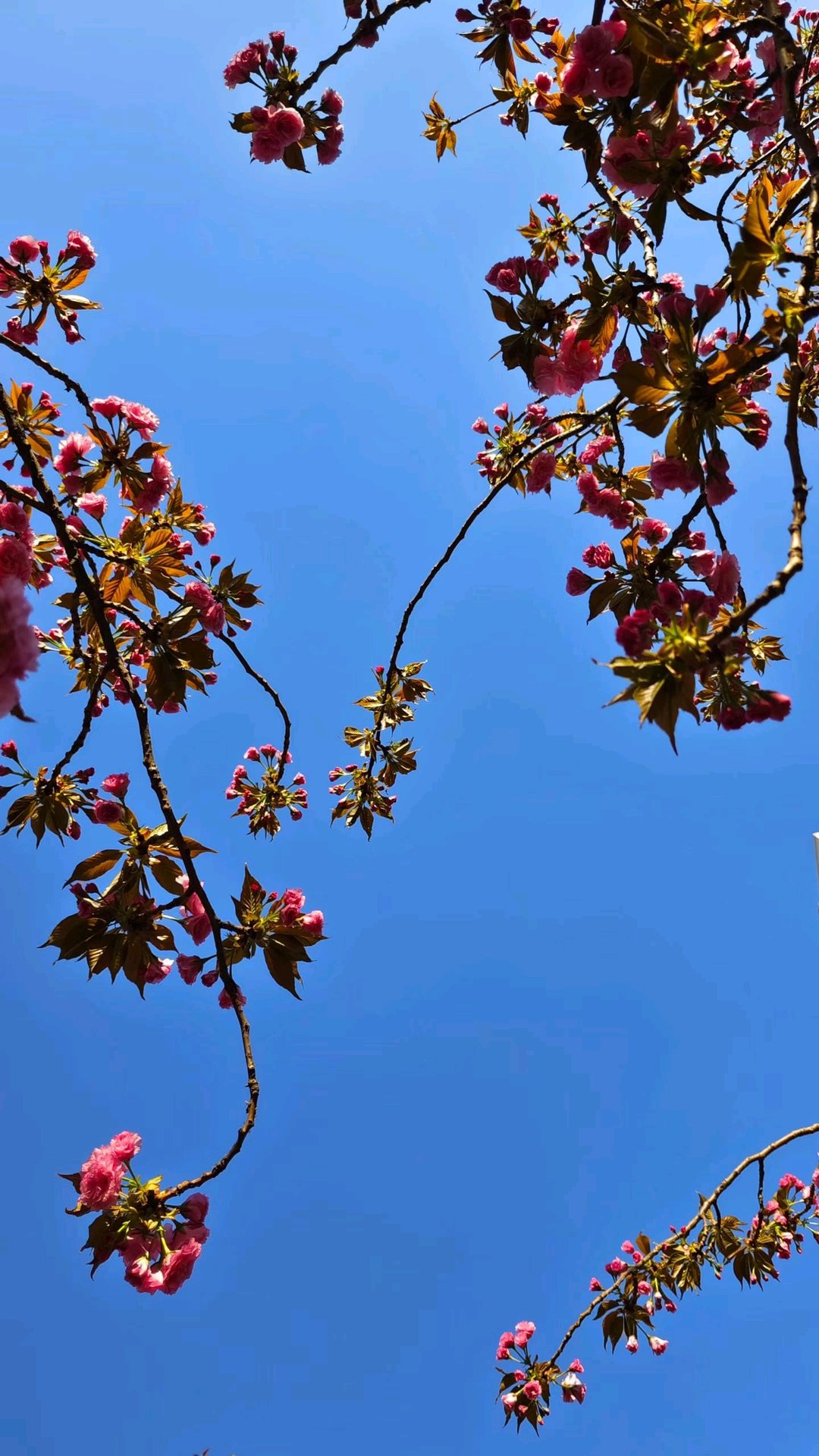 没有一丝云絮的天空,像被彻底清洗过的蓝色锦缎,将粉红晚樱衬得愈发舒展。每一簇盛放的花朵,都在捕捉着这盛春难得的晴好。