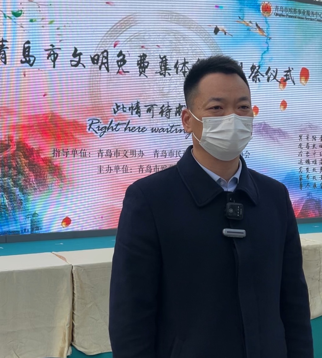 王强是这个团队的两位主持人之一。平时他是生态葬办理处工作人员,负责生态安葬,海葬、树葬、生态葬的主持都是他。殡仪馆为了推广新型祭扫方式,到了清明、过年、农历十月初一这三大祭扫节点,专门安排为家属安排了共祭,他就被调来共祭岗位。