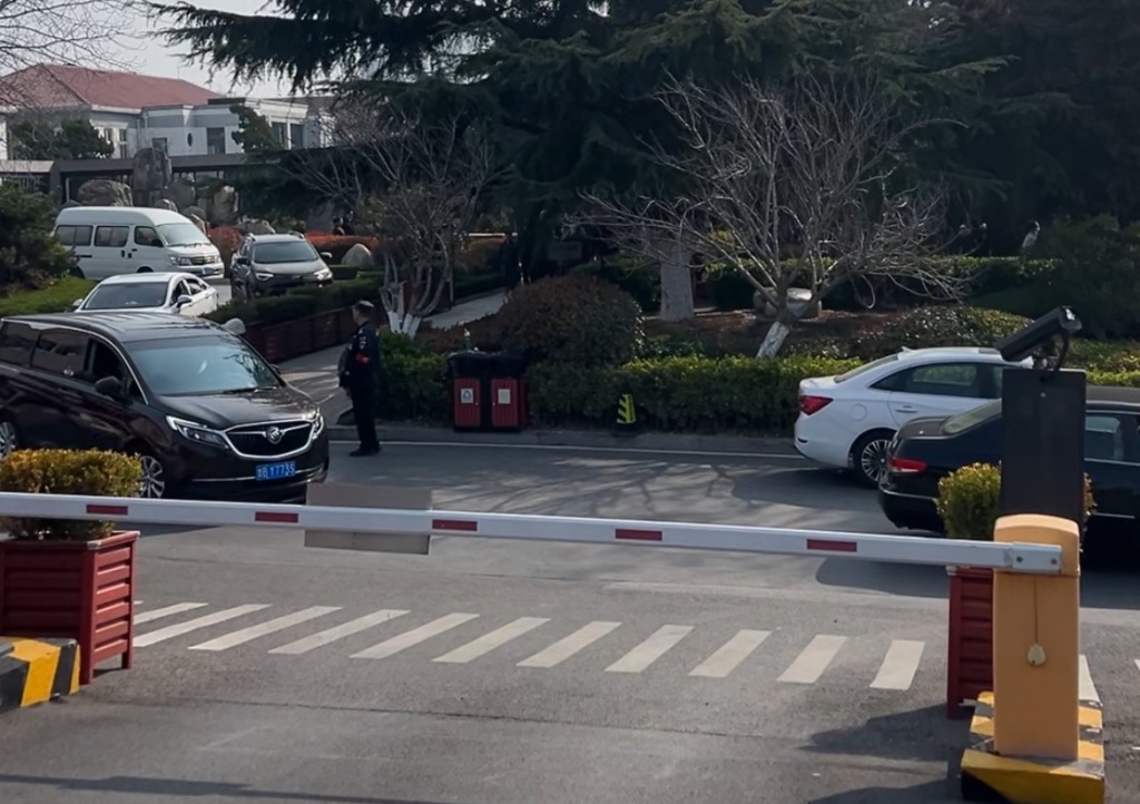 保卫人员孙盛虎把对讲机别在腰间,走到南北门之间的岗亭。上午6点半,天色已亮,但气温仍低,他呼出一口气,在晨风里凝成一团白雾,随即散了。