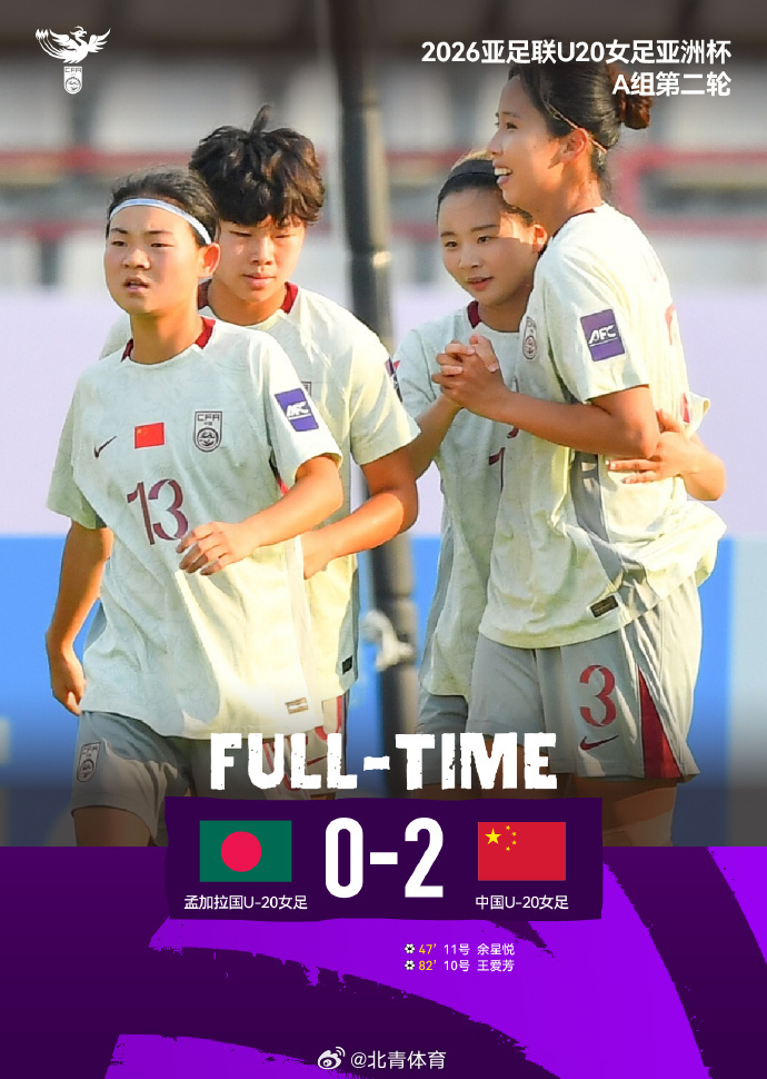 据新华社,4月4日,在泰国暖武里府举行的2026年亚足联U20女足亚洲杯小组赛次轮,中国队以2:0战胜孟加拉国队,获得两连胜。