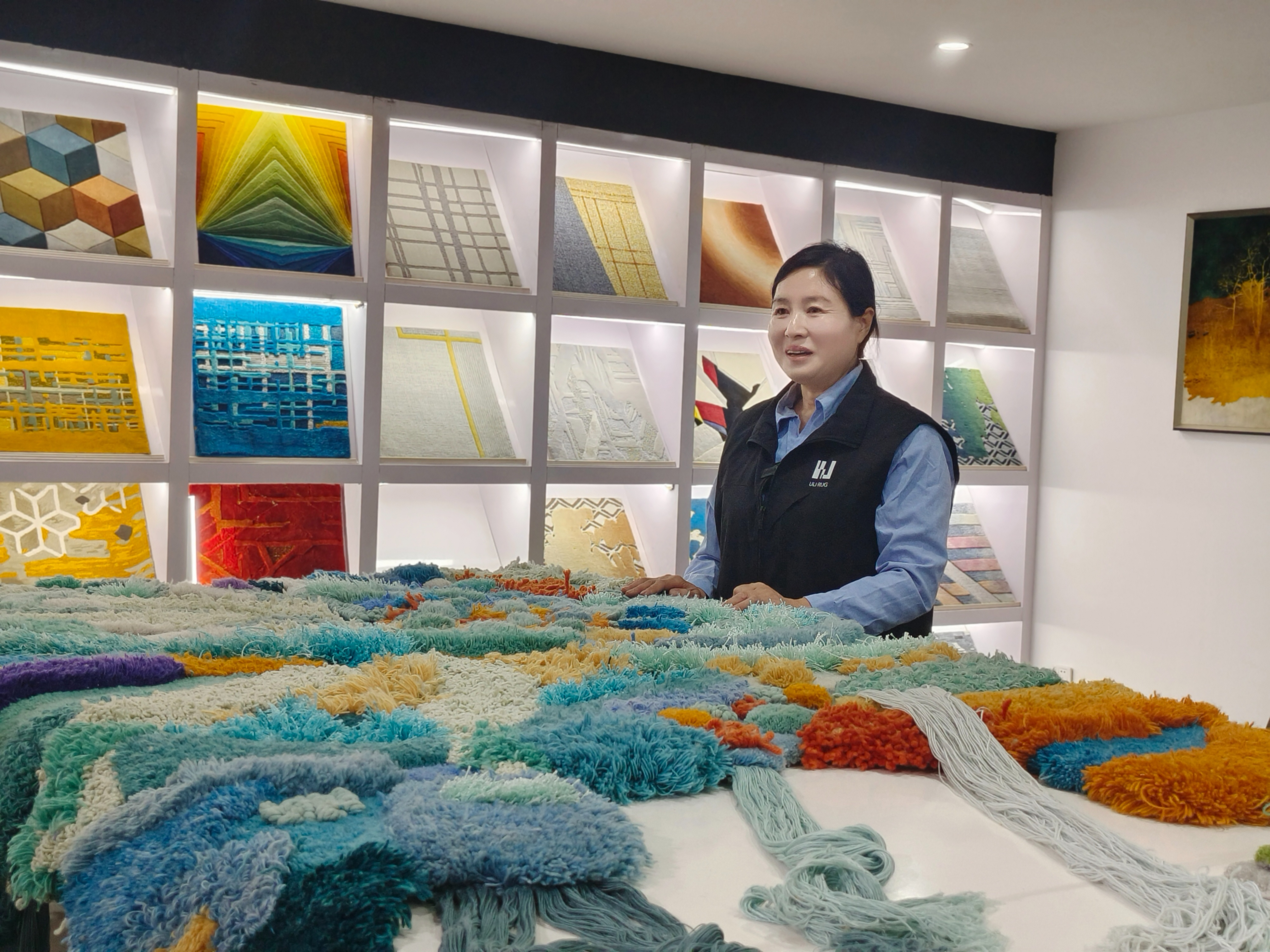 “这是一场关于耐心的修行,从前期设计图案、选毛、纺线、染色、绘制、手工枪刺、刷胶,平毯、修剪……每一道工序都是对工匠心性的考验。以最为核心的手绘和枪刺为例,这是手工地毯区别于机织地毯的灵魂所在。工人们利用电枪根据印在布上的版样一针一线刺绣,常规尺寸,图案简单的地毯需要一位师傅耗时5天制作完成,复杂图案则需要两周的时间。正是这种坚持坚持,赋予了阳信地毯极强的韧性与寿命。”瑞鑫集团有限公司董事长助理刘学林说。