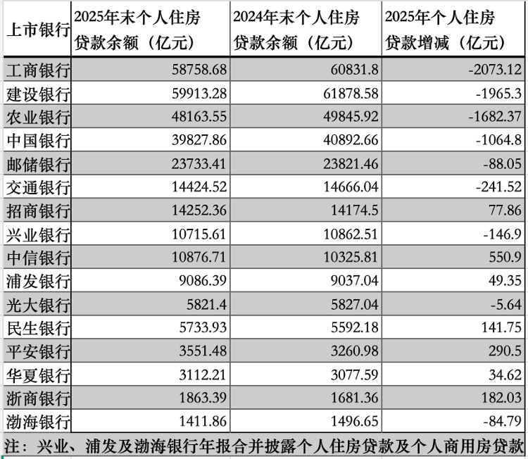 记者根据国有六大行和上市股份行2025年年报统计发现,作为按揭贷款发放主力军,国有六大行的个人住房贷款余额去年均出现减少,10家上市全国性股份制银行(招行、兴业、中信、民生、浦发、光大、平安、华夏、浙商、渤海)中,7家增长,3家减少。