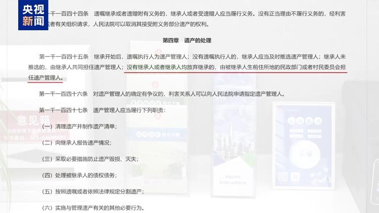 主持人 白岩松:五年前,民法典首次确立了我国的遗产管理人制度,规定无人继承的遗产由民政部门或村委会担任管理人。但现实状况是,全国层面仍然缺乏统一、清晰的规则,基层民政部门面对这份新的法律职责,心里没底,不敢管,也不愿接。遗产怎么处置,身后事的支出标准怎么把握,无主遗产的去向又如何监督,这些具体问题,目前也缺乏更为明晰的制度规范。除了北京、上海等少数地区有了操作指引,更多地方仍在“摸着石头过河”。这项充满善意的制度,是时候补齐规则、理顺流程了,我们是不是该有全国统一的操作细则,既让基层民政部门干得安心,也让老百姓看着放心呢。