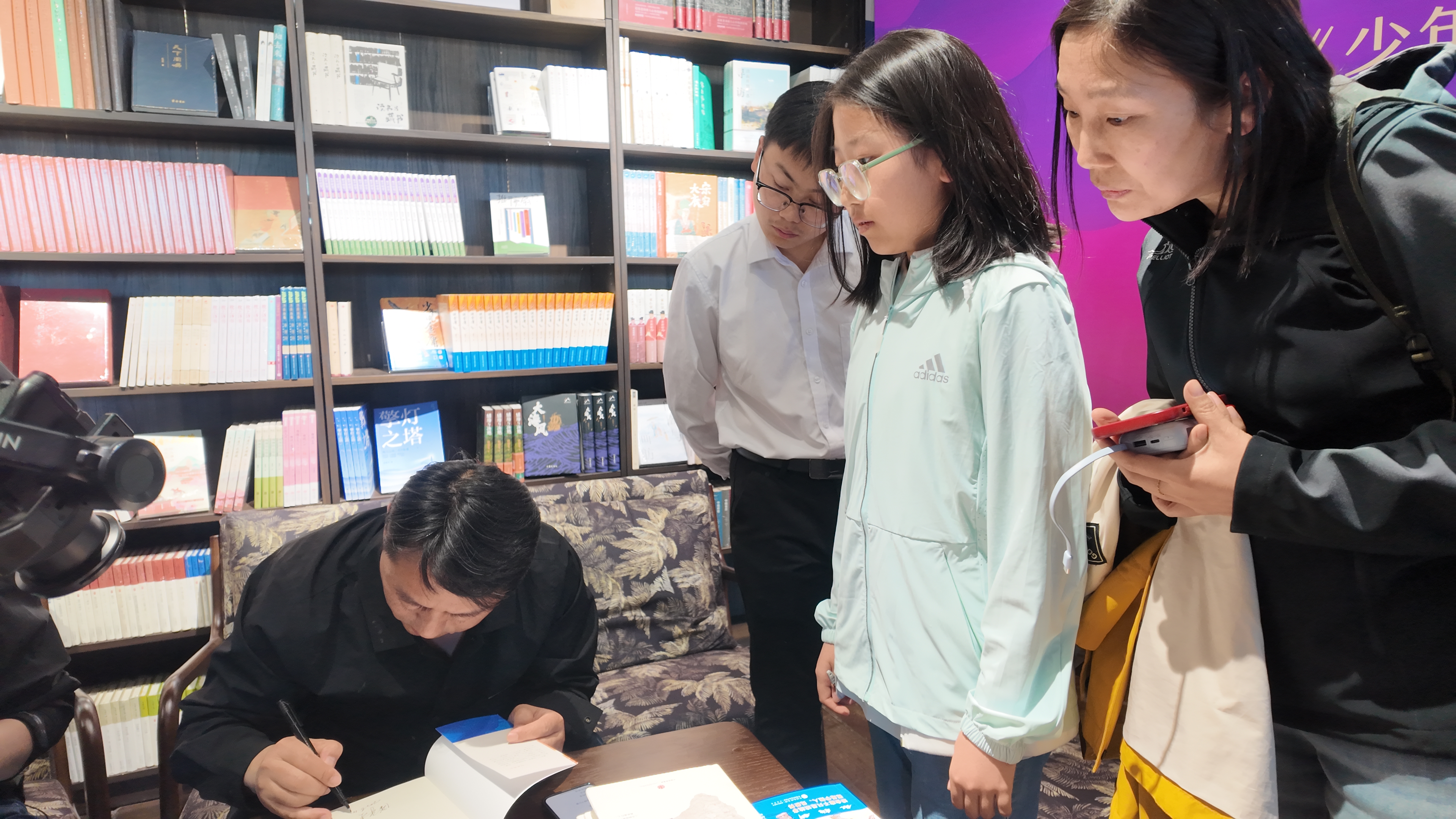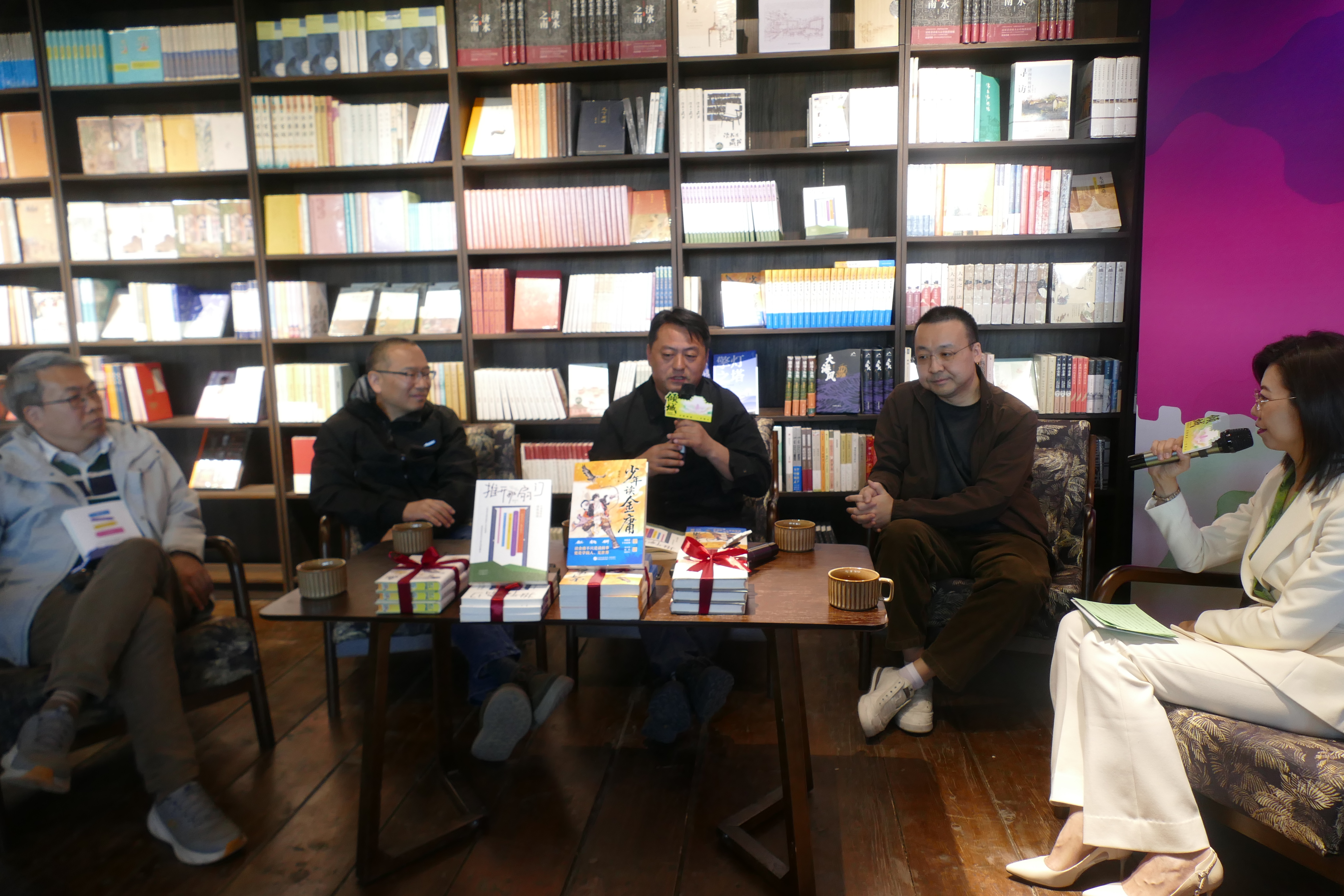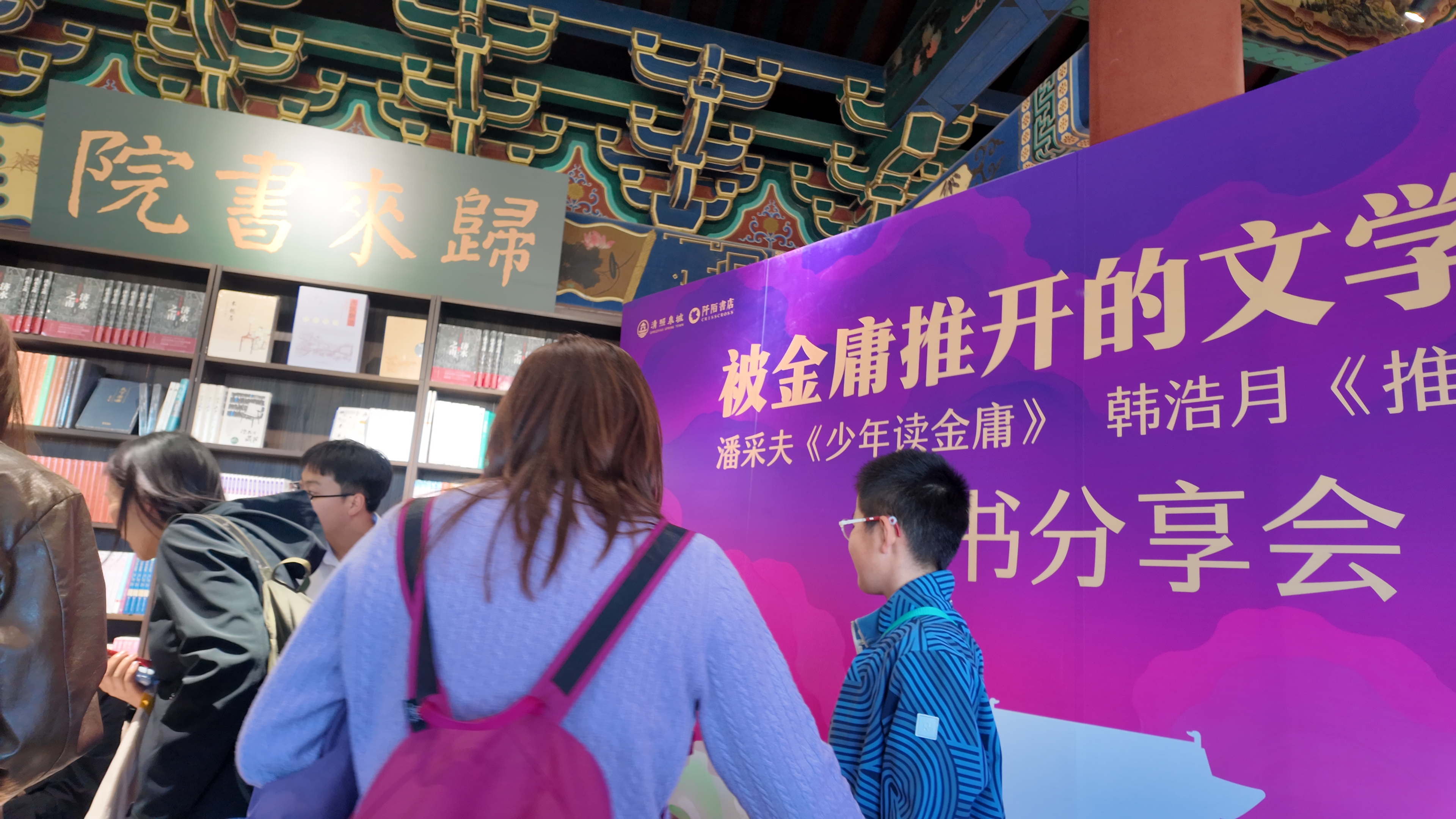 4日下午,另一场别开生面的新书分享会在清照泉城西城墙上的归来书院上演。作家潘采夫带着他的《少年读金庸》,作家韩浩月带着他的《推开那扇门》,与读者见面,绿茶、武云溥一起分享。会后,4位作家还与读者互动,并进行签名。现场始终被一股浓郁的文学气息所笼罩,进场的游客屏住呼吸,倾听这场饶有趣味的文学对话。来自青岛实验学校初一的李旭彤与爸妈一起游清照泉城,不仅听完全场,还提出自己关心的问题,获得与作家单独交流的机会。