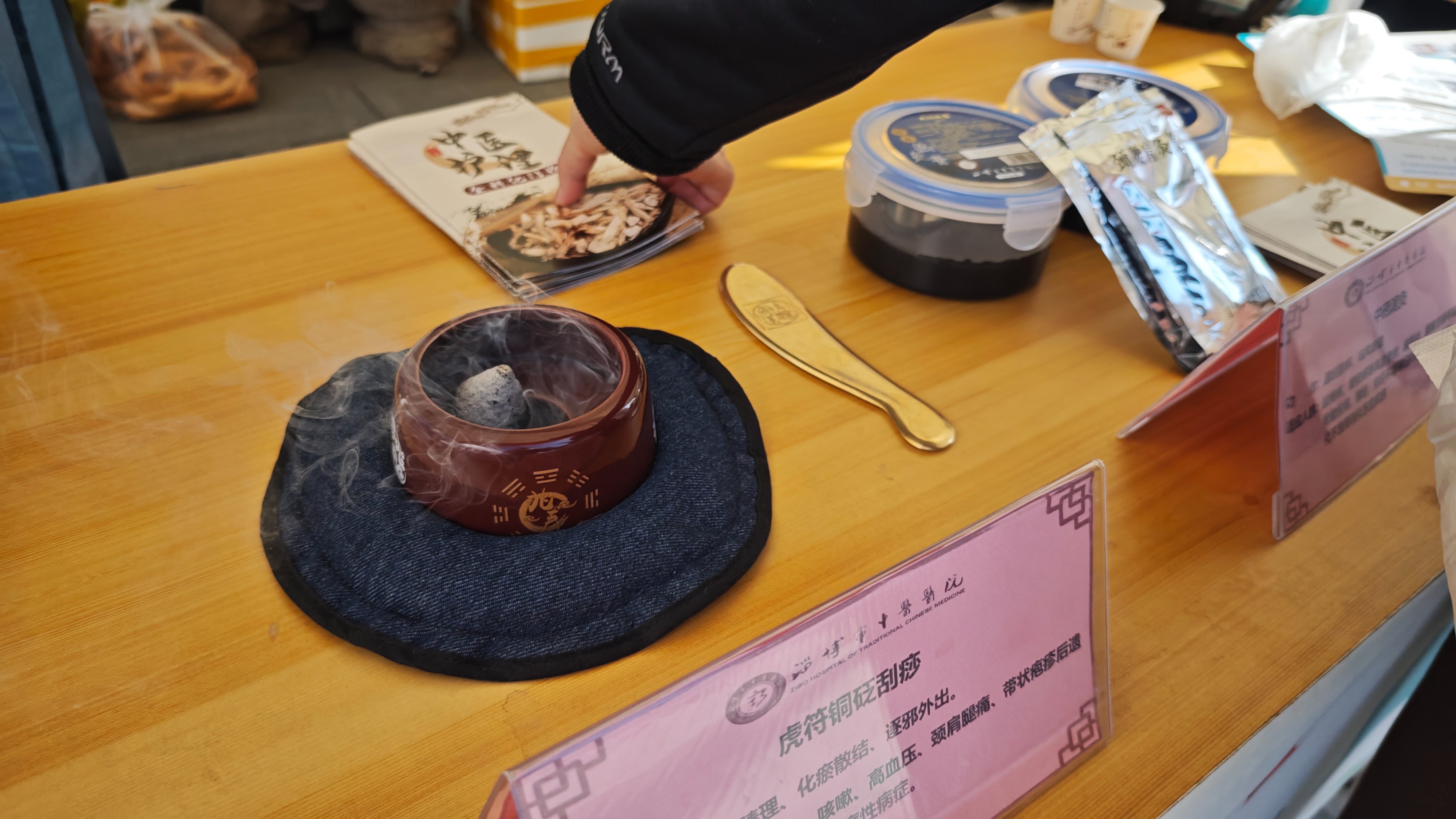 市集精准聚焦中医药非遗传承与康养服务普及,划分为医类区、药类区、工类区三大功能区域,全方位呈现中医药“诊、治、养、材、制、品、工、器、俗、文创”的丰富内涵。医类区里,淄博市中医医院、市妇幼保健院等多家医疗机构的名医专家坐镇,围绕脾胃调理、心脑血管养护、春季养生等主题,为市民提供一对一脉诊、体质辨识与个性化健康指导,专业服务触手可及;药类区展示着各类中药饮片、药食同源产品,结合清明养生需求调制的茶饮香气四溢,工作人员现场讲解配方原理,让“药食同源”的智慧融入日常;工类区则汇聚了20余项淄博及周边的非遗传统医药项目,整骨疗法传承人现场演示正骨理筋技艺,手法娴熟精准;古城膏药、赵培印面瘫膏药传承人展示药材炮制全过程,从选料、熬制到成型,每一步都透着老祖宗的制药智慧。