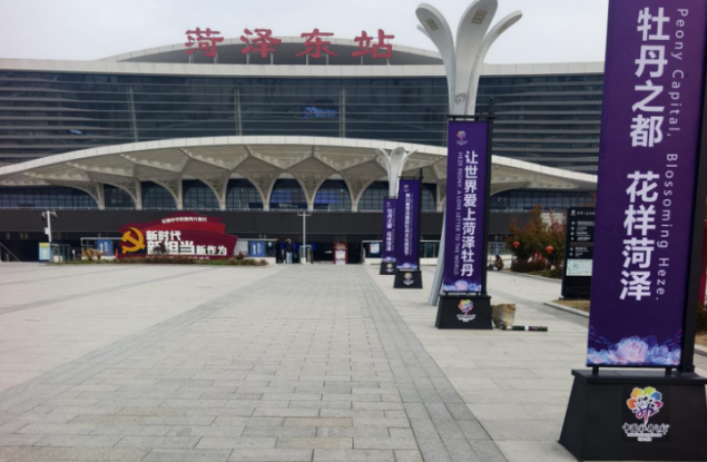 在交通枢纽核心区域,陈集镇精准布局,让牡丹元素融入旅客出行全流程。菏泽东站作为客流重要入口,站前广场两侧整齐布置8面牡丹主题道旗,鲜艳的花色与文字相映成趣,第一眼便传递出节会的热情;在高铁站内部下站台楼梯区域,精心绘制12幅牡丹贴画,国色天香的画面与楼梯空间巧妙融合,为旅客营造出步步是景、处处生花的出行体验。二楼候车大厅内,牡丹主题竖式广告牌与灯箱大屏醒目亮相,以大气的设计和丰富的牡丹文化内涵,进一步优化了枢纽视觉环境,让每一处细节都彰显牡丹节会的独特韵味。