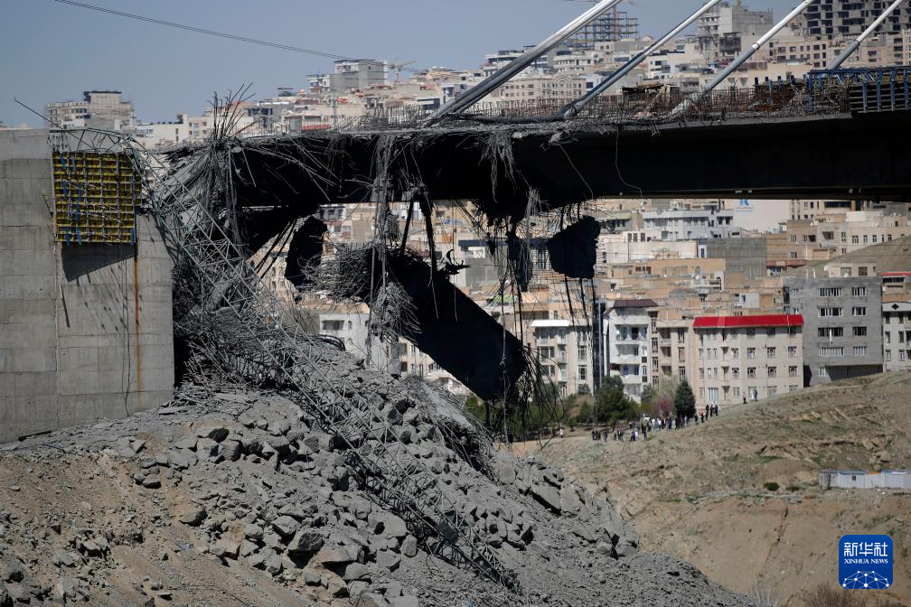 这是4月3日拍摄的伊朗卡拉季市贝伊克公路桥遭空袭受损状况。