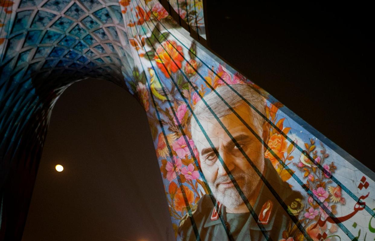 2021年1月1日,伊朗伊斯兰革命卫队下属“圣城旅”指挥官苏莱曼尼的头像被投射到德黑兰地标建筑自由塔上,悼念苏莱曼尼遇难周年。新华社