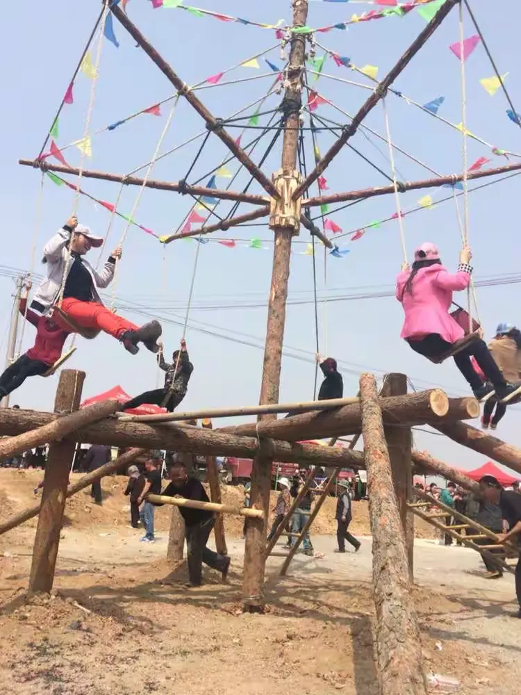 秋千之戏,古称“半仙戏”。《淄川县志》《乐陵县志》《齐河县志》均简略提及“妇女归宁,作秋干戏”或“庭院设秋千戏”。在清代嘉庆版《寿光县志》,以及1941年的《潍县志稿》中,其记载则令人叹为观止。寿光有“转轮秋千”,“植双木于院落……缚车轮于木杪,而垂屈板于周遭,有多至三十二索者”,由人推动,妇女靓妆盘旋空中,“翩若舞蝶”;潍县(今潍坊)城外白狼河边则有“转秋千”,“柱下围一木栅,内有人推柱使转,节之以锣,当锣声急时推走如飞”,更有勇健少年攀上柱顶,表演“猴儿坐殿”“童子拜观音”等杂技,谓之“打故事”。在经济富庶的潍坊,当地的思想也颇为自由开放,连秋千的玩法,也可从庭院游戏演变为公共竞技表演的盛况。