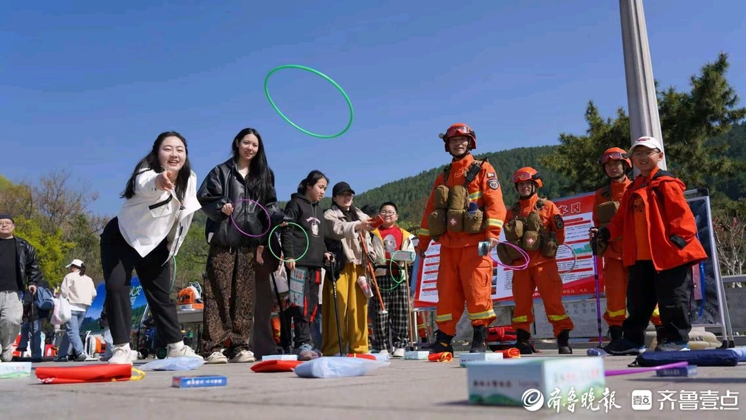 “叔叔,这个怎么玩?”在泰山天外村宣传点,一个七八岁的小男孩指着地上的套圈游戏跃跃欲试。消防员蹲下来笑着告诉他:“套中哪个,就答对上面的问题,有小礼物哦。”不一会儿,小男孩成功套中一个写着“发现火情打什么电话”的卡片,大声喊出“119”,周围游客纷纷鼓掌。