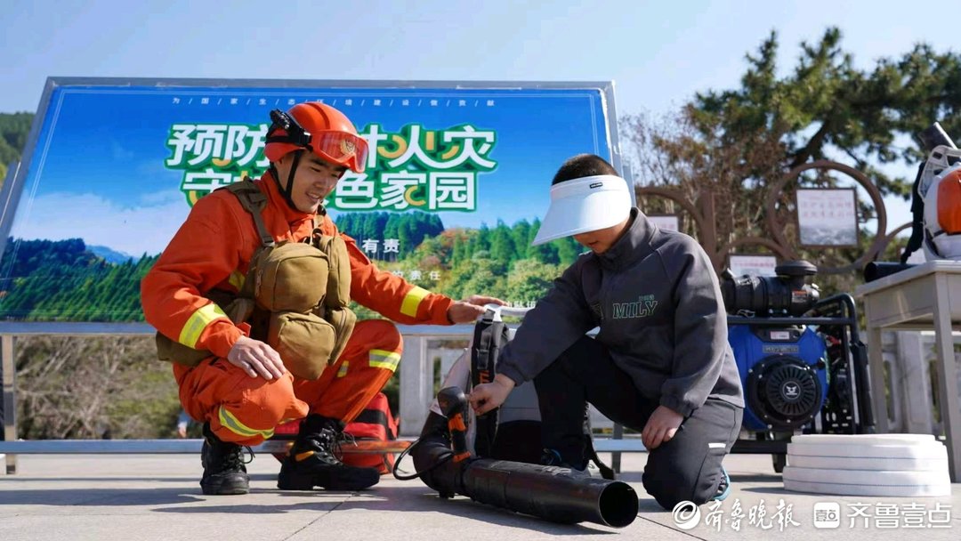 除了游戏,现场还有“实操课”:风力灭火机、油锯、水枪,消防员手把手教大家怎么用。“以前光见过,真让我用还真不会,今天试了一下,竟然还有这么多说道。”泰安的王先生在体验完风力灭火机后感慨。