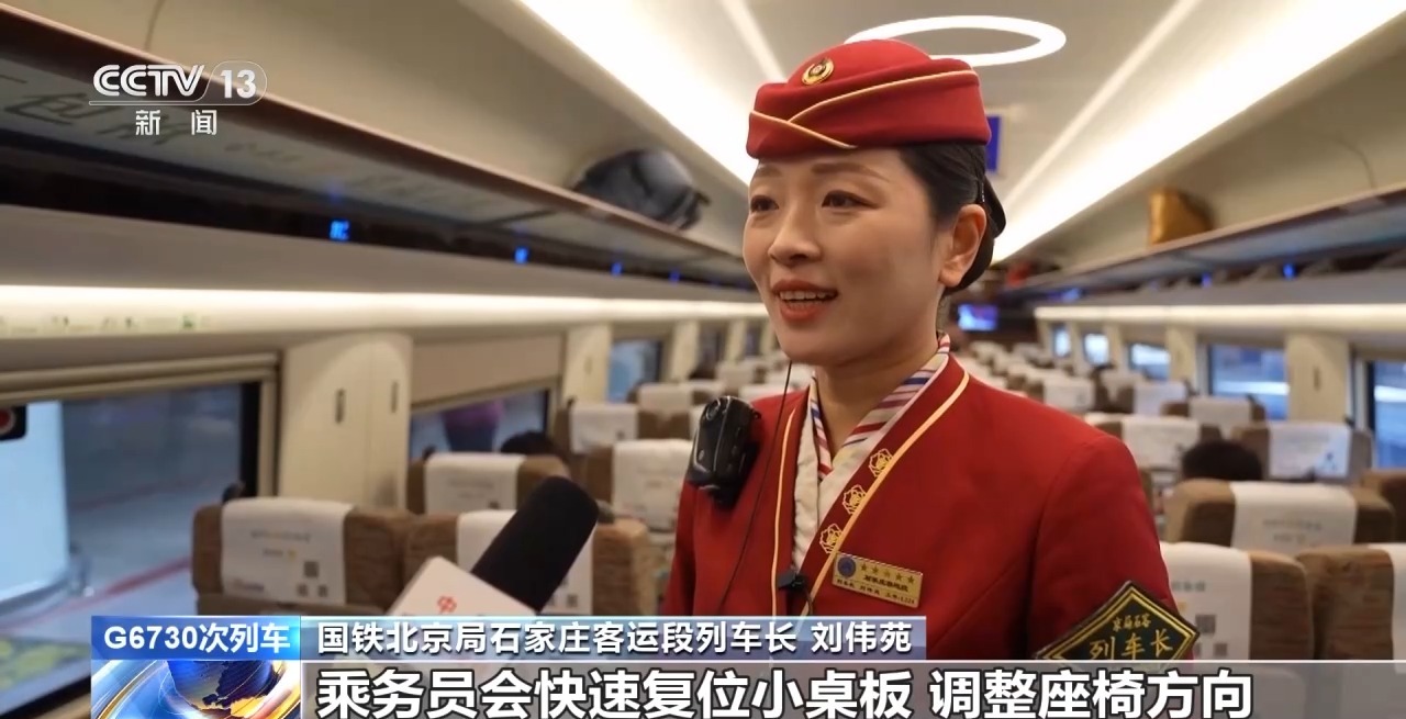 国铁北京局石家庄客运段列车长 刘伟苑:列车换向停靠期间,乘务员会快速复位小桌板、调整座椅方向,同时对车厢、卫生间等重点区域进行清洁保洁。