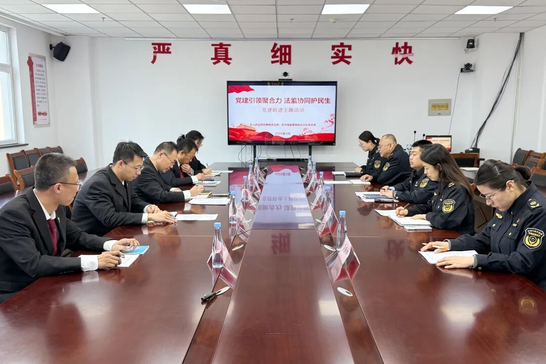 为进一步深化府院联动机制,以党建与业务深融互促推动审判工作高质量发展,近日,烟台市福山区人民法院刑事庭党支部联合福山区市场监管局执法大队党支部,开展“党建引领聚合力 法监协同护民生”主题党建共建活动。双方通过联学党建经验、共研执法难题、共商民生保障,以“红色引擎”驱动法治合力,为规范市场监管执法、守护群众合法权益注入强劲动能。