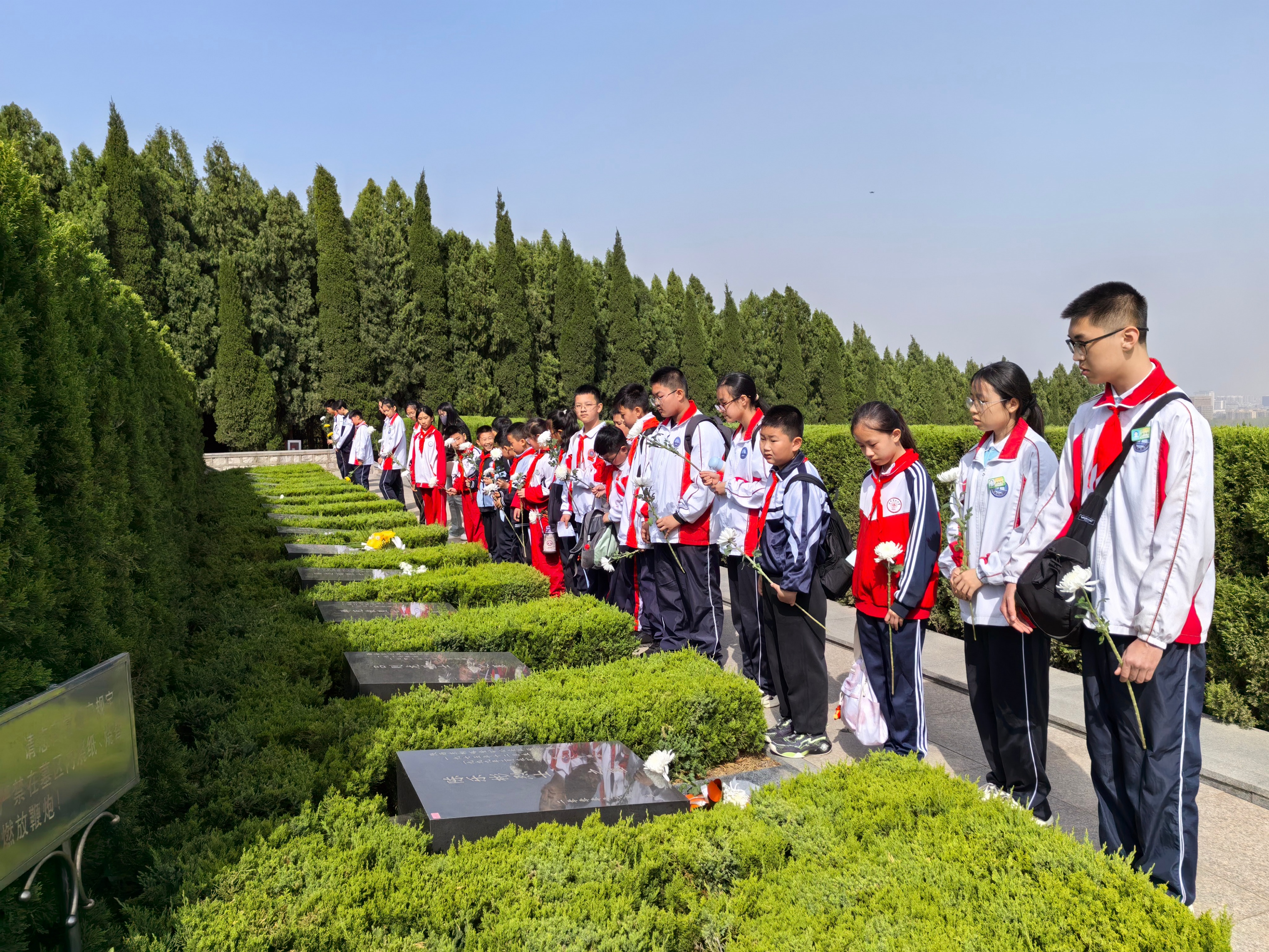陵园内庄严肃穆,全体人员整齐肃立。雄壮的国歌声响起,孩子们身姿挺拔、神情庄重;全场默哀一分钟,向为民族解放和人民幸福英勇献身的革命先烈,致以最深切的缅怀与敬意。