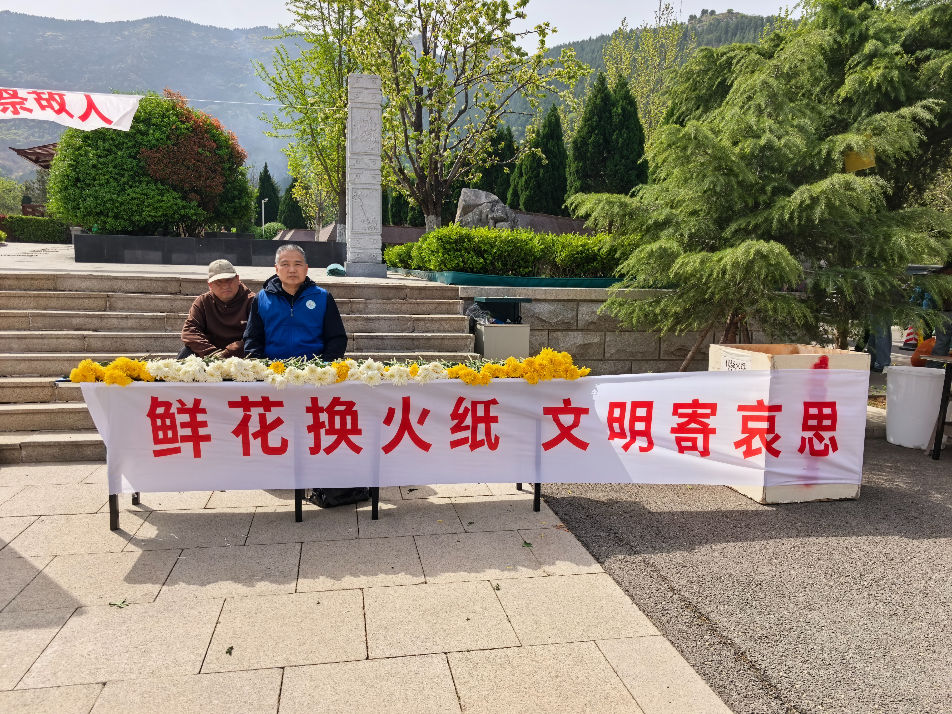 4月5日上午,济南市市中区玉函山公墓的“鲜花换火纸”兑换点前,市民张先生刚换完祭扫用的菊花,他直言用鲜花祭祀既庄重又环保,这样的方式特别好。