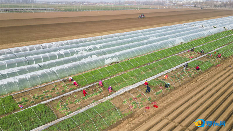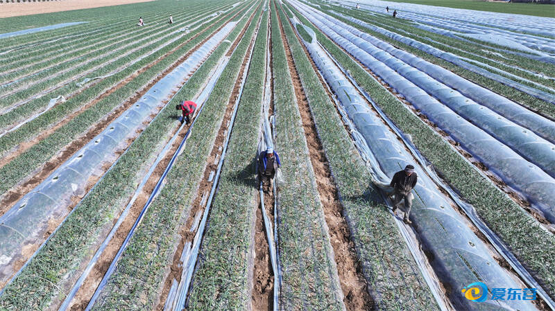 广饶县李鹊镇沟头村的农田里,农民正在为洋葱撤去棚膜。