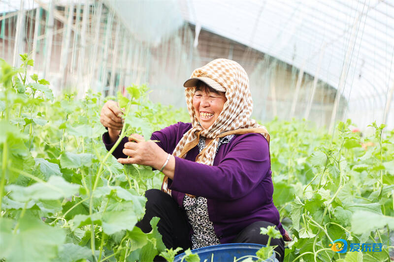 温室大棚里的甜瓜藤蔓正攀着吊绳生长,农民忙着掐枝吊蔓。