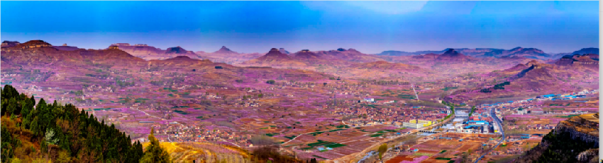 中国第五大地貌→岱崮地貌与万亩梯田桃林相映成趣,奇崮耸立、花海层叠,登崮上草原俯瞰,崮在花中、花绕崮行,景观独特又震撼。