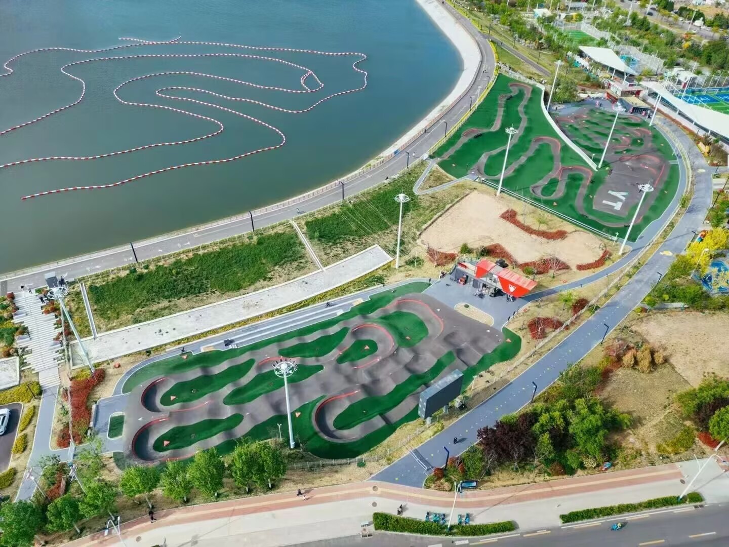 坐落于莱山区凤凰湖的Velosolutions泵道公园,是符合国际标准的专业泵道场地,拥有吉尼斯世界纪录认证的“最大高度差沥青泵道”,凭借完善的配套设施、专业的场地配置,已然成为全国泵道运动的核心阵地与标杆样板。