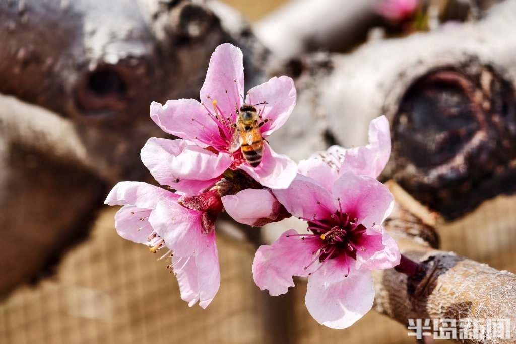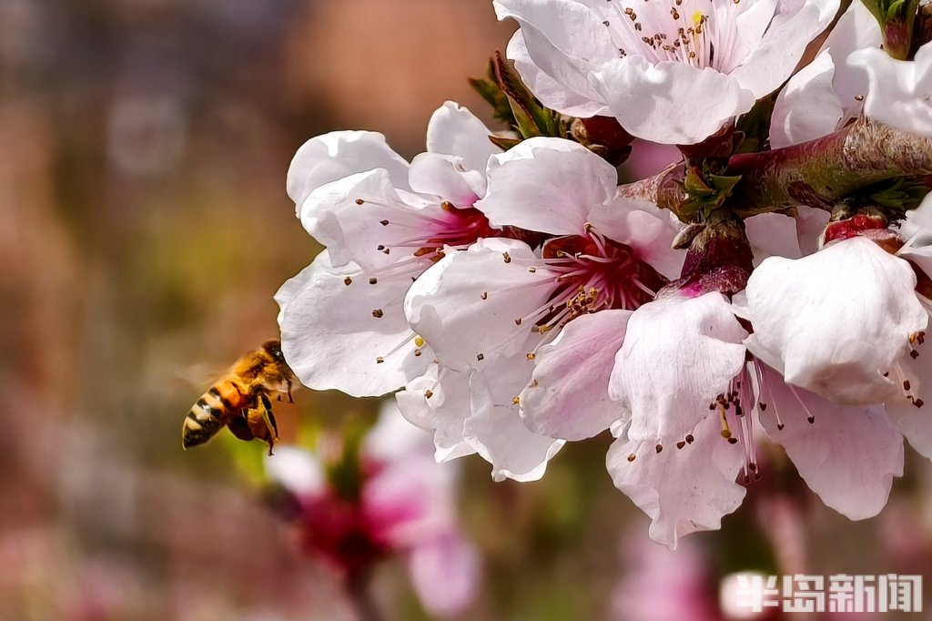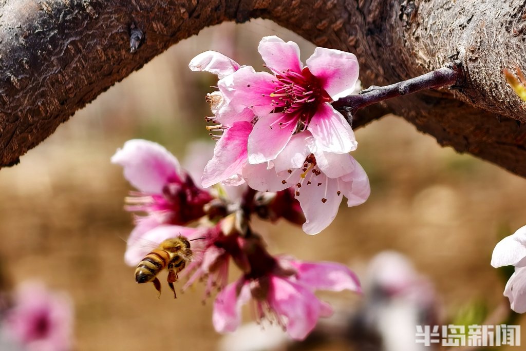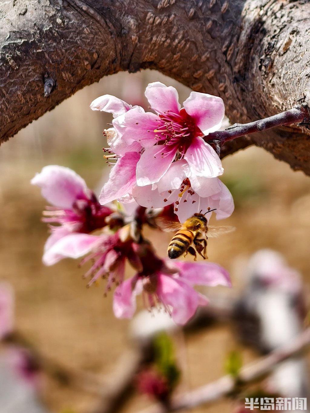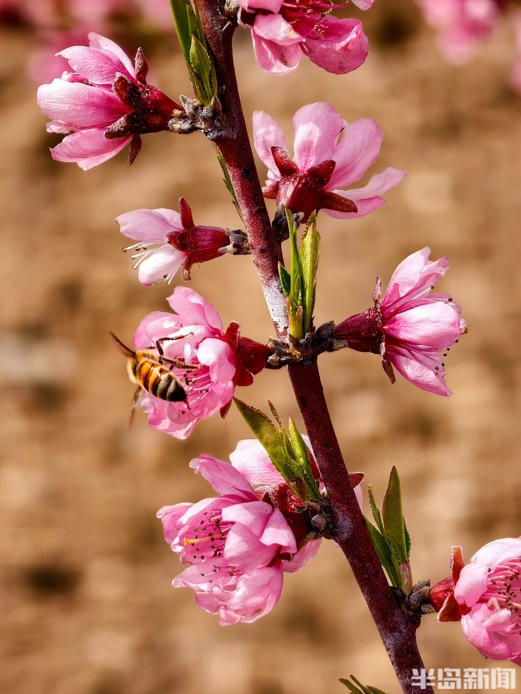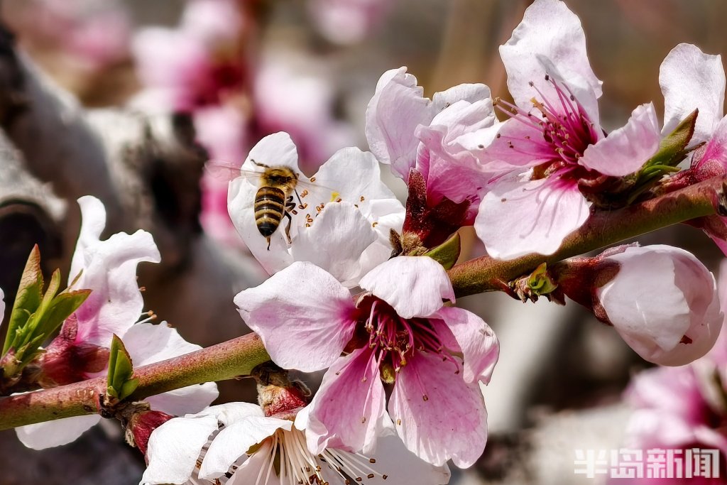 4月5日,青岛平度市桃林陆续进入盛花期。漫山桃花竞相绽放,粉红色的花海如云似霞,将春日田野装点得格外绚烂。花丛间,成群的蜜蜂穿梭飞舞,一头扎进金黄的花蕊里,腿上沾满沉甸甸的花粉。“桃花开得旺,蜜蜂采蜜忙,这可是咱果农的好兆头!”果农老王指着自家桃园,脸上满是笑意。桃花灼灼,蜂鸣嘤嘤。这片粉色承载着果农们一年丰收的希望。(半岛全媒体记者吴璟)