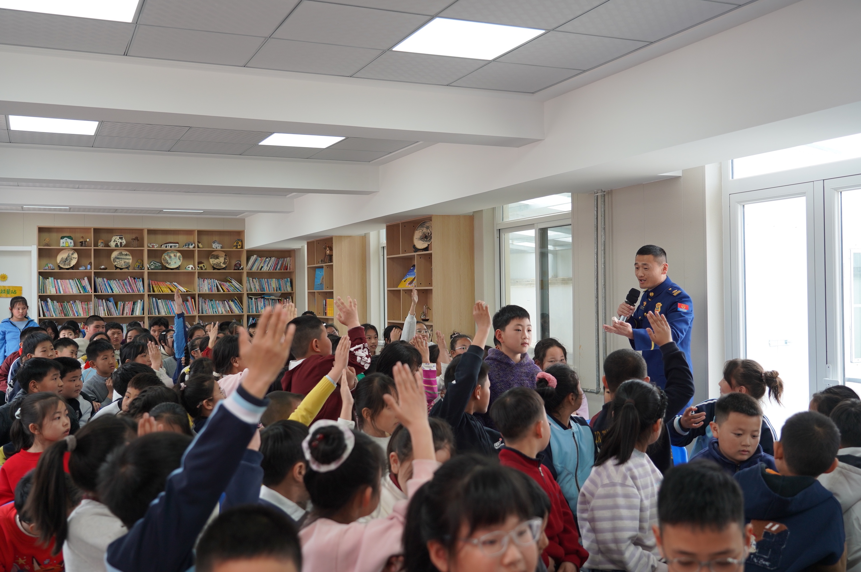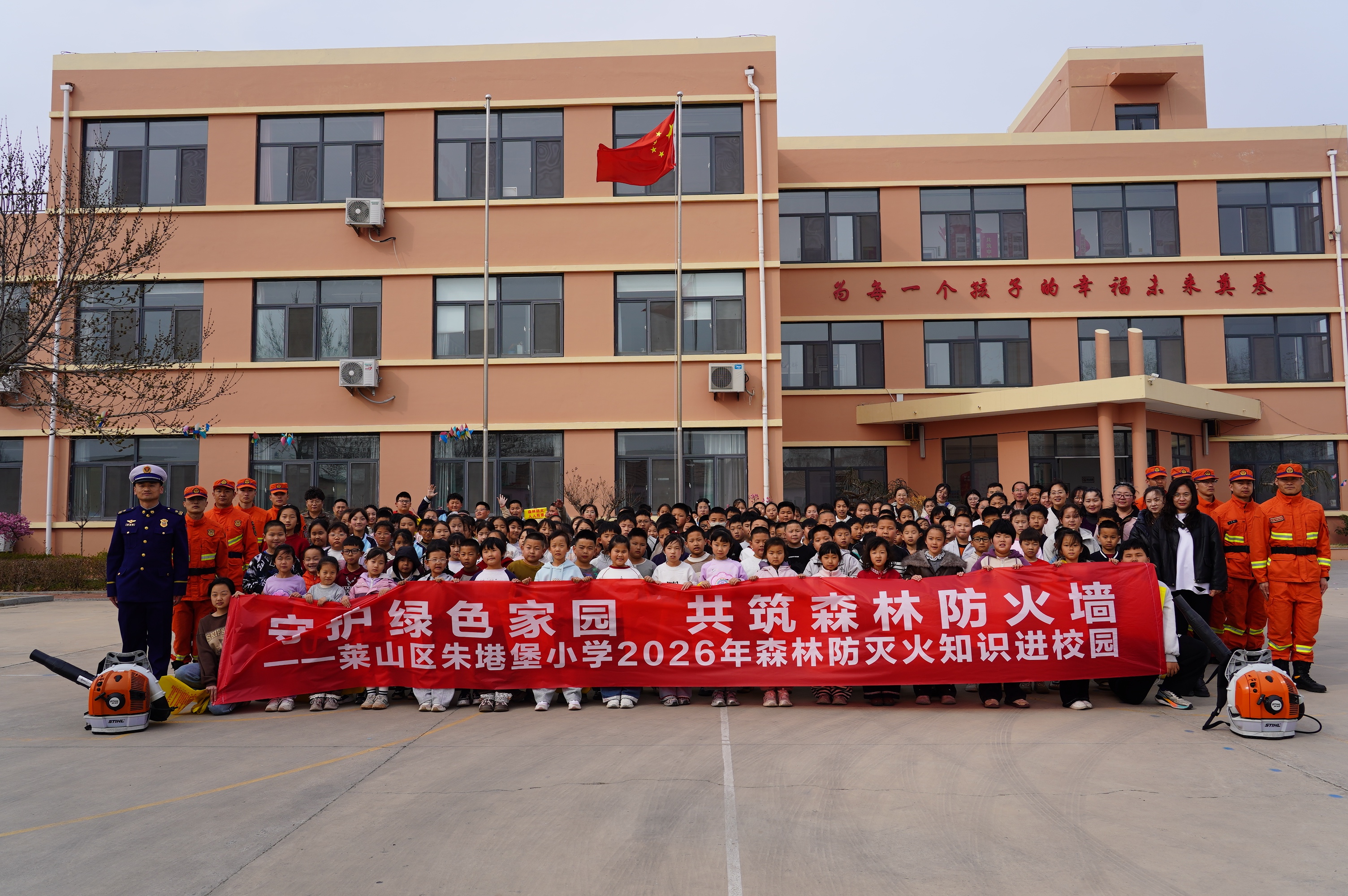 防火的功夫,不只下在坟区。就在清明假期前一天,烟台莱山区朱塂堡小学里,另一批消防救援指战员把防火宣传搬进了课堂。没有枯燥的照本宣科,而是带着装备让孩子们亲手摸、亲眼看。