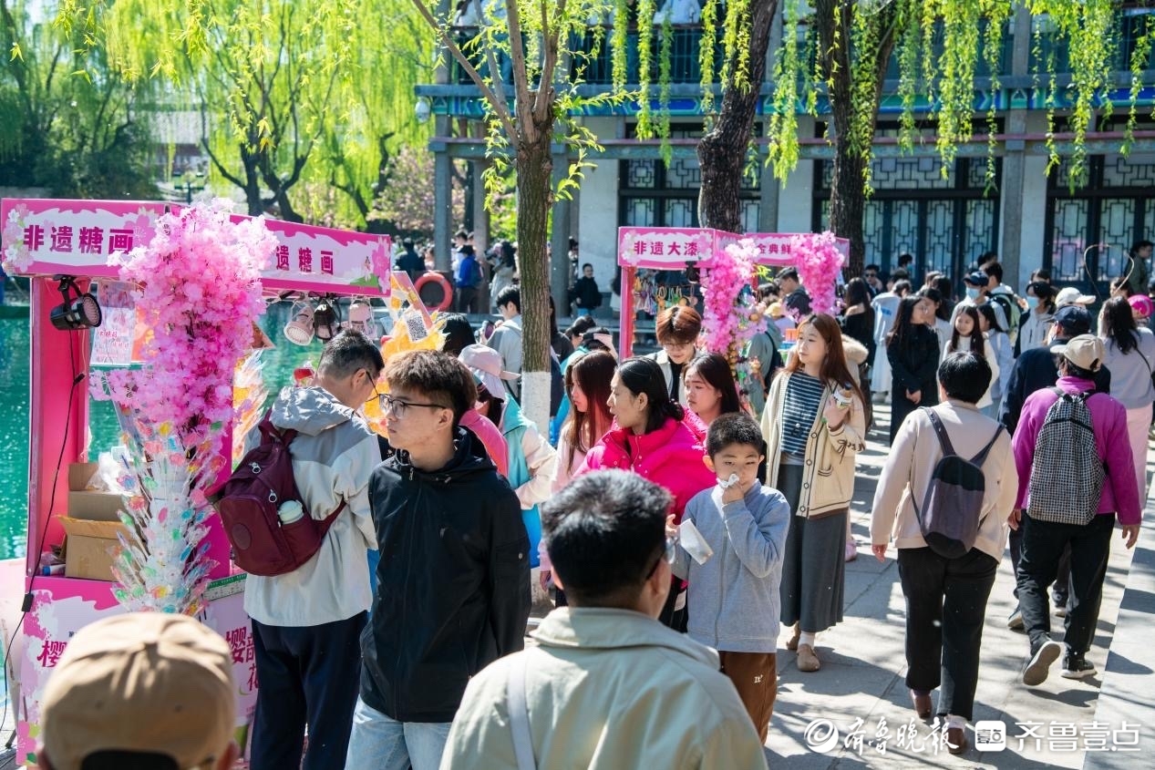 作为济南的“流量担当”,趵突泉绿柳如烟,繁花似锦,吸引众多游客踏春而来。三股水喷涌有力,尽显勃勃生机;花朝荟市集融合泉畔好物与非遗手作,泉水泡茶散发诱人茶香。游客们在欣赏自然美景的同时,也能深入感受传统文化的独特韵味。