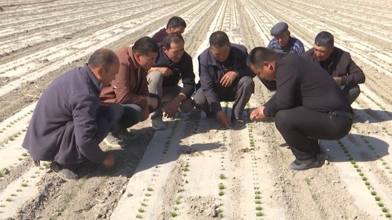岳普湖县铁热木镇协开尔村村民查看冬播孜然出苗情况。岳普湖县融媒体中心记者亚库普江摄
