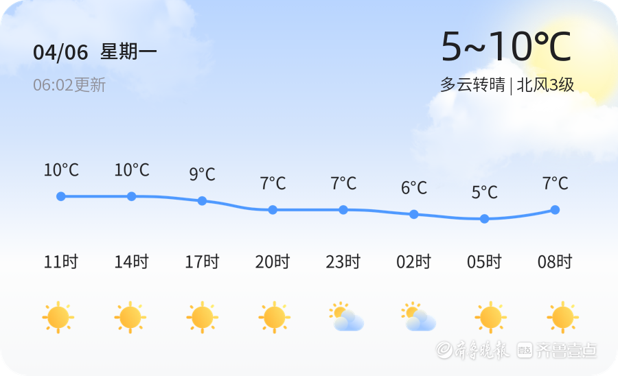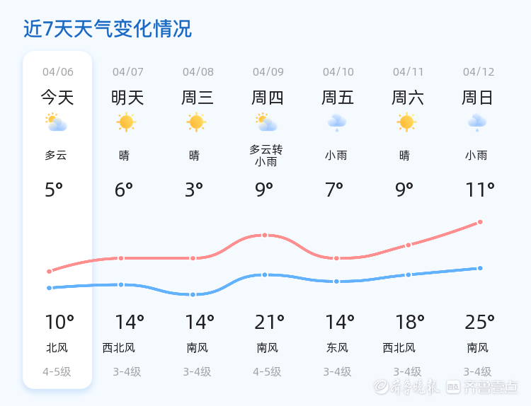 今日是4月6日,星期一,农历二月十九。烟台市今天天气多云转晴,气温介于5℃到10℃之间,北风3级,空气湿度为66%,PM2.5指数为34,空气质量良好。各区天气情况基本一致,市民外出时建议随身携带薄外套,以应对气温变化。 明天烟台天气将转为晴朗,气温有所上升,最低气温6℃,最高气温14℃,风力将增强至西北风3-4级。与今日相比,明日阳光更充足,适合户外活动,但风力稍大,市民需注意防范。 未来三天,烟台天气总体以晴到多云为主,气温逐渐回升,最高气温可达14℃。周四将迎来小雨天气,市民需提前做好防雨准备。周四风力较大,南风4-5级,降雨可能对交通造成一定影响,建议市民出行携带雨具,注意交通安全。 市民出行时,请密切关注天气变化,及时增减衣物,防范大风和降雨对出行的影响。特殊天气期间,建议市民尽量选择公共交通工具,确保出行安全。